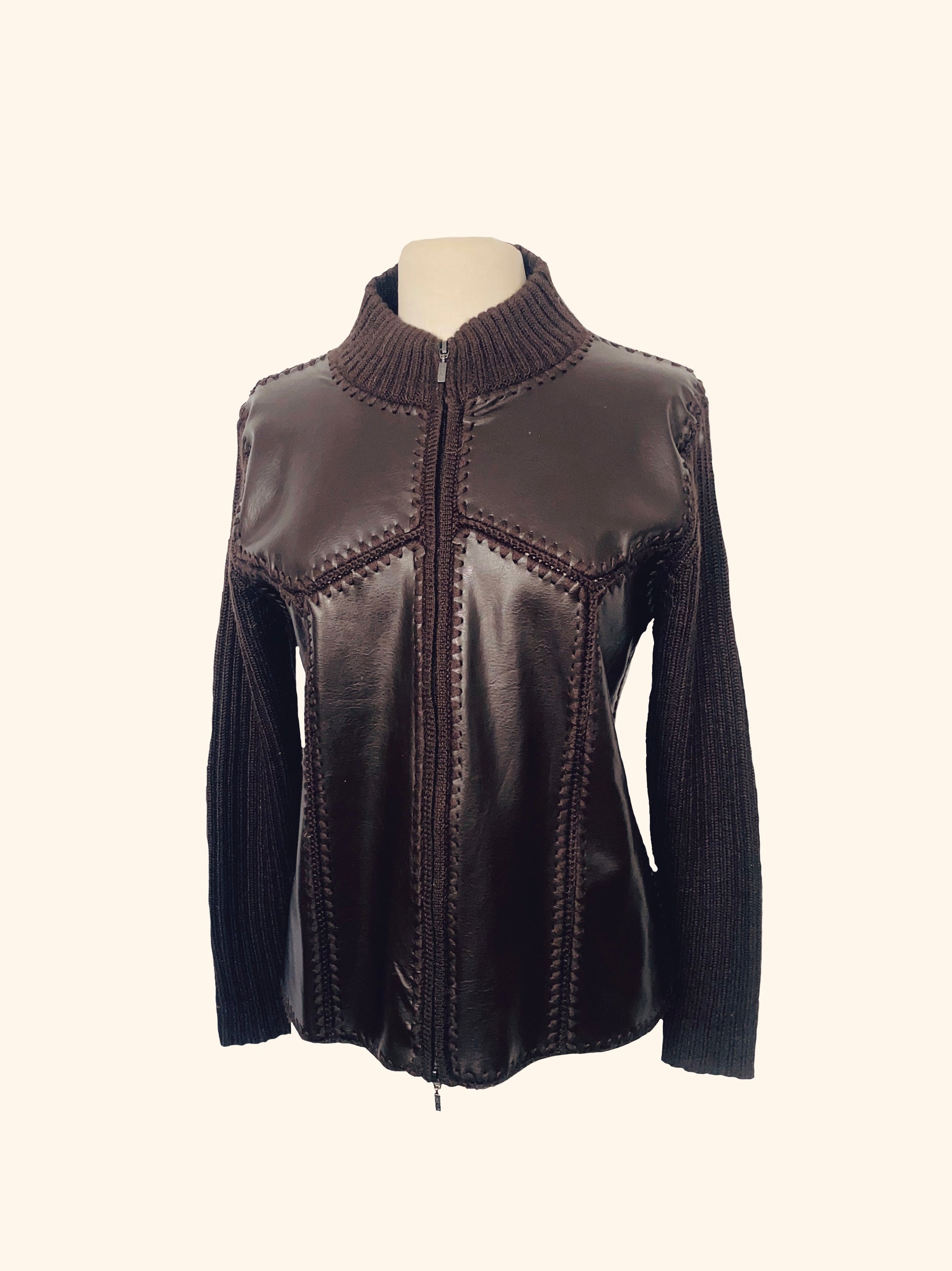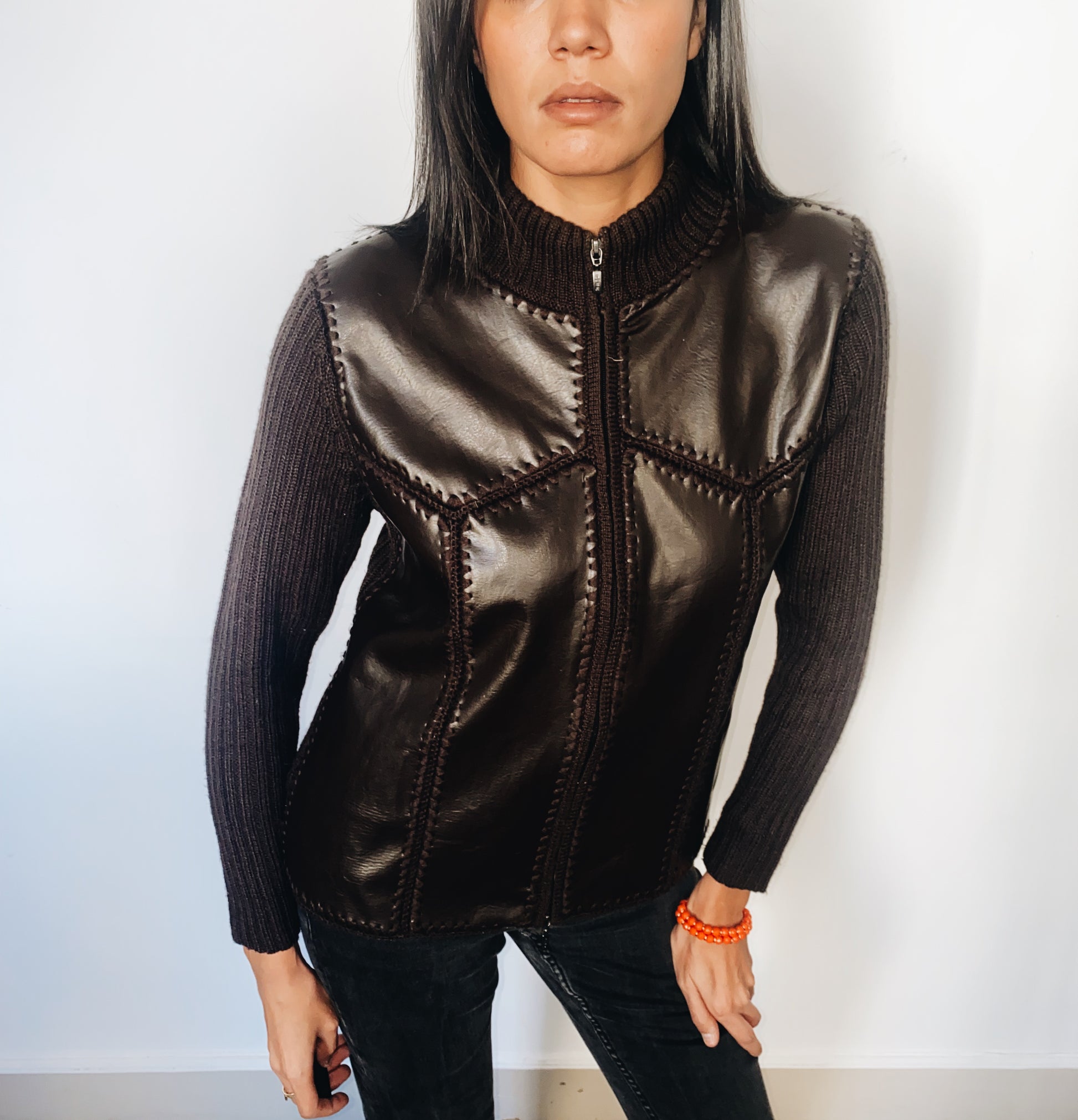 Gilet vintage bi-matière laine et cuir véritable lisse marron, en très bon état sans défauts. Taille 38. Parfait pour compléter votre look indie avec une touche vintage.