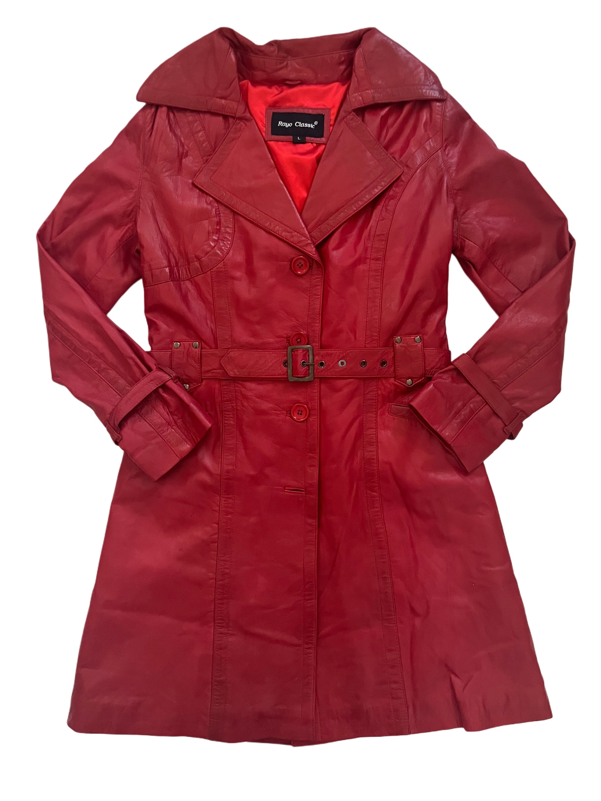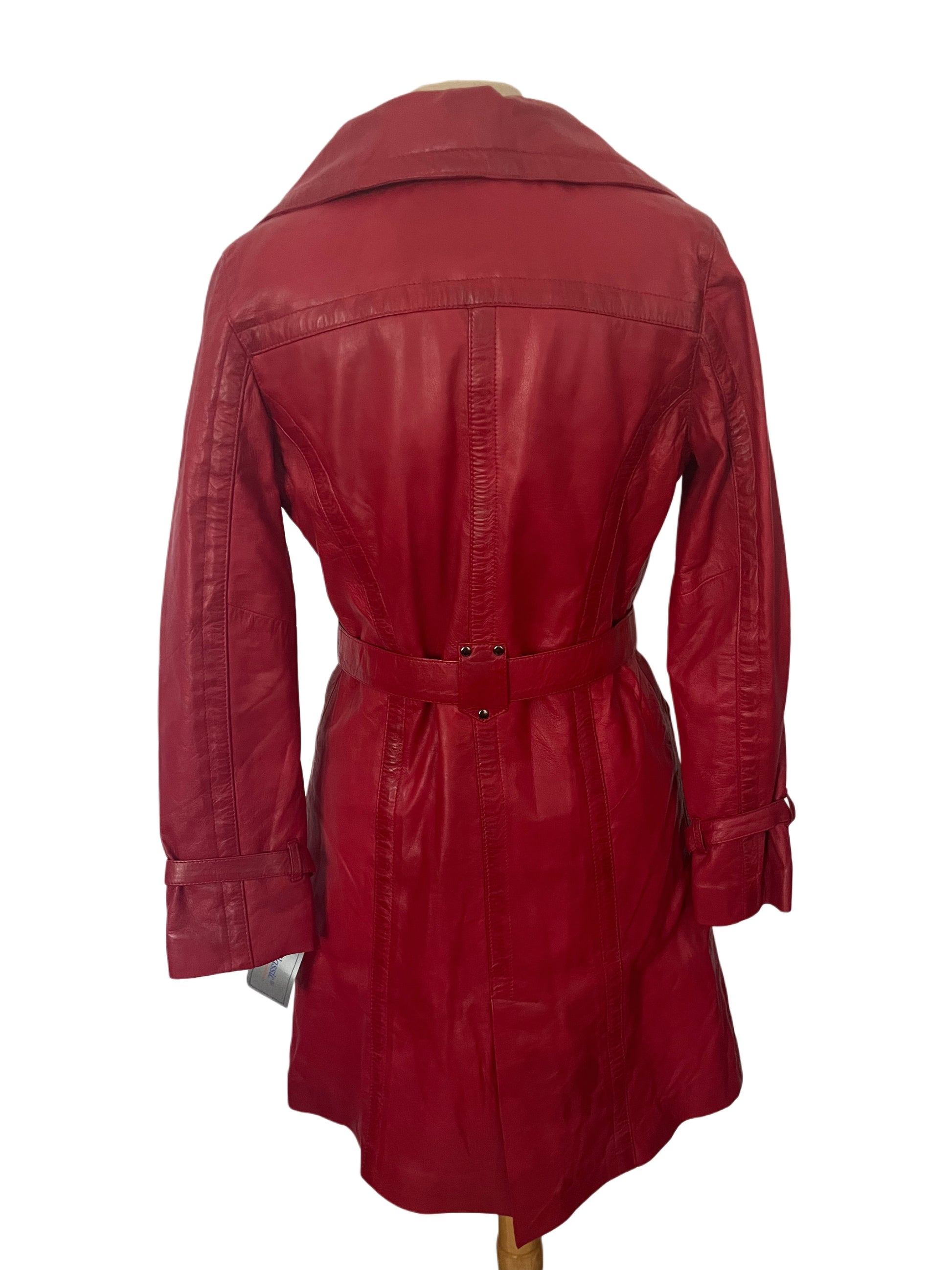 Manteau long vintage en cuir véritable rouge, neuf avec étiquette (prix d’origine : 490 €). Style trench coat, avec poches plaquées à la base, ceinture ajustable à la taille et sangles réglables au bas des manches. Cuir souple et doux, de très belle qualité, sans défauts. Taille 40/ L