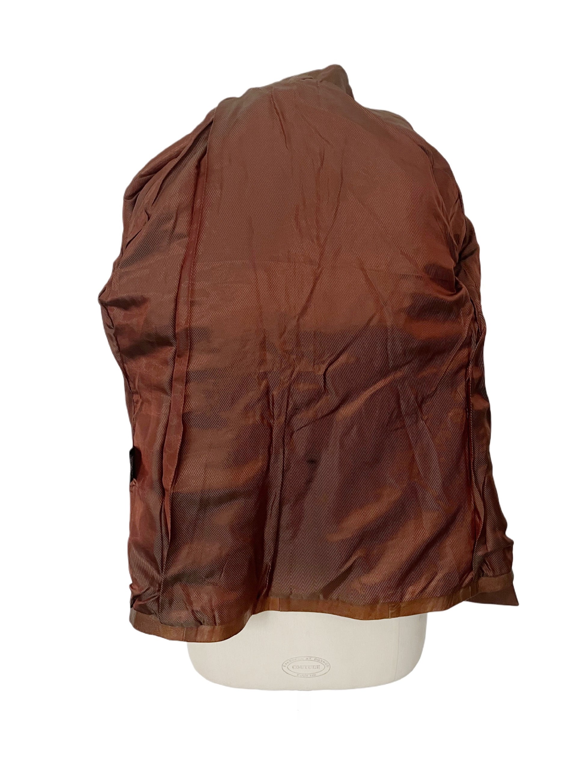 Veste blazer vintage en cuir véritable lisse, couleur noisette. Coupe légèrement cintrée, poches plaquées à la base et fermeture par boutonnière centrale. Doublure intacte, veste en parfait état, sans aucun défaut.