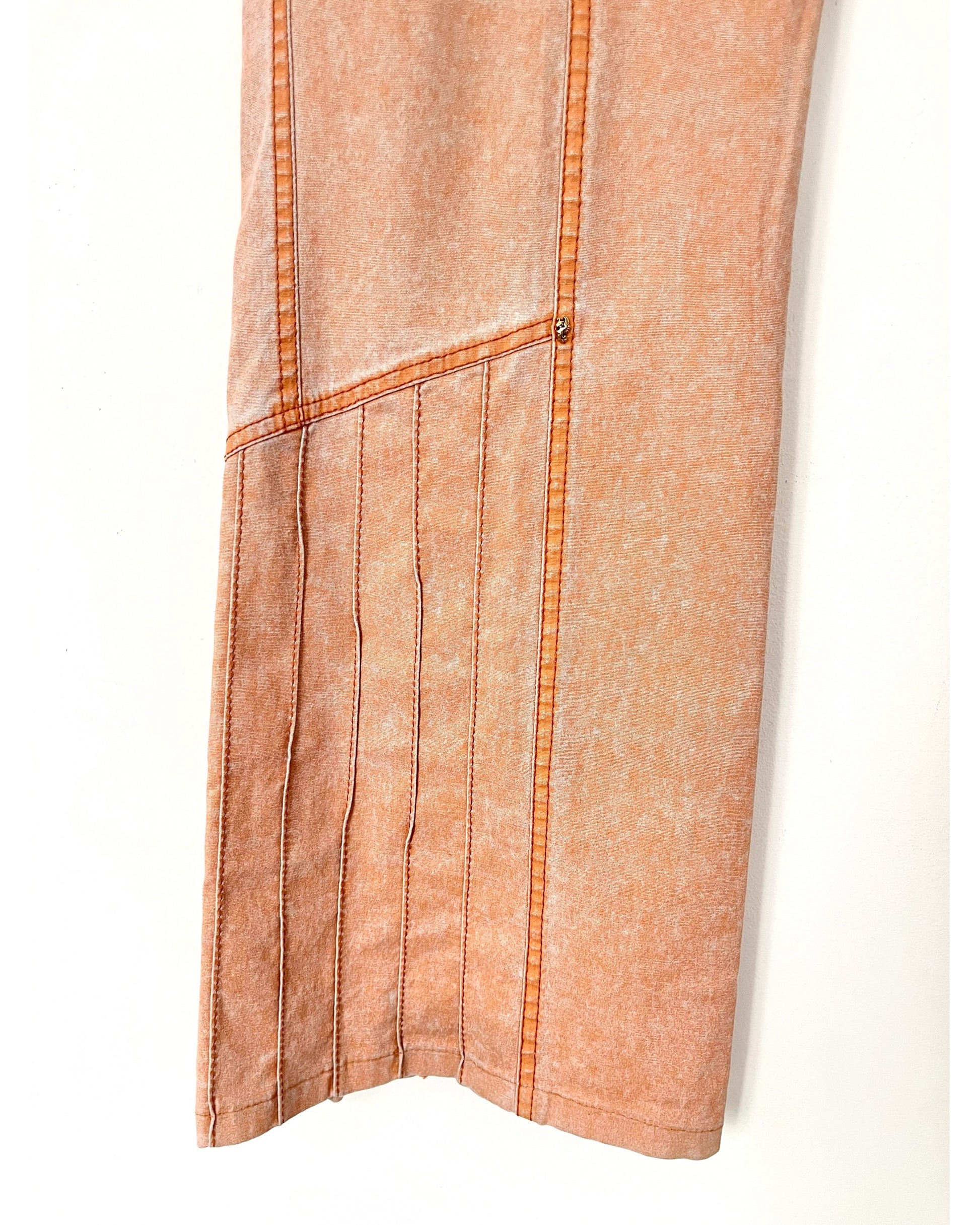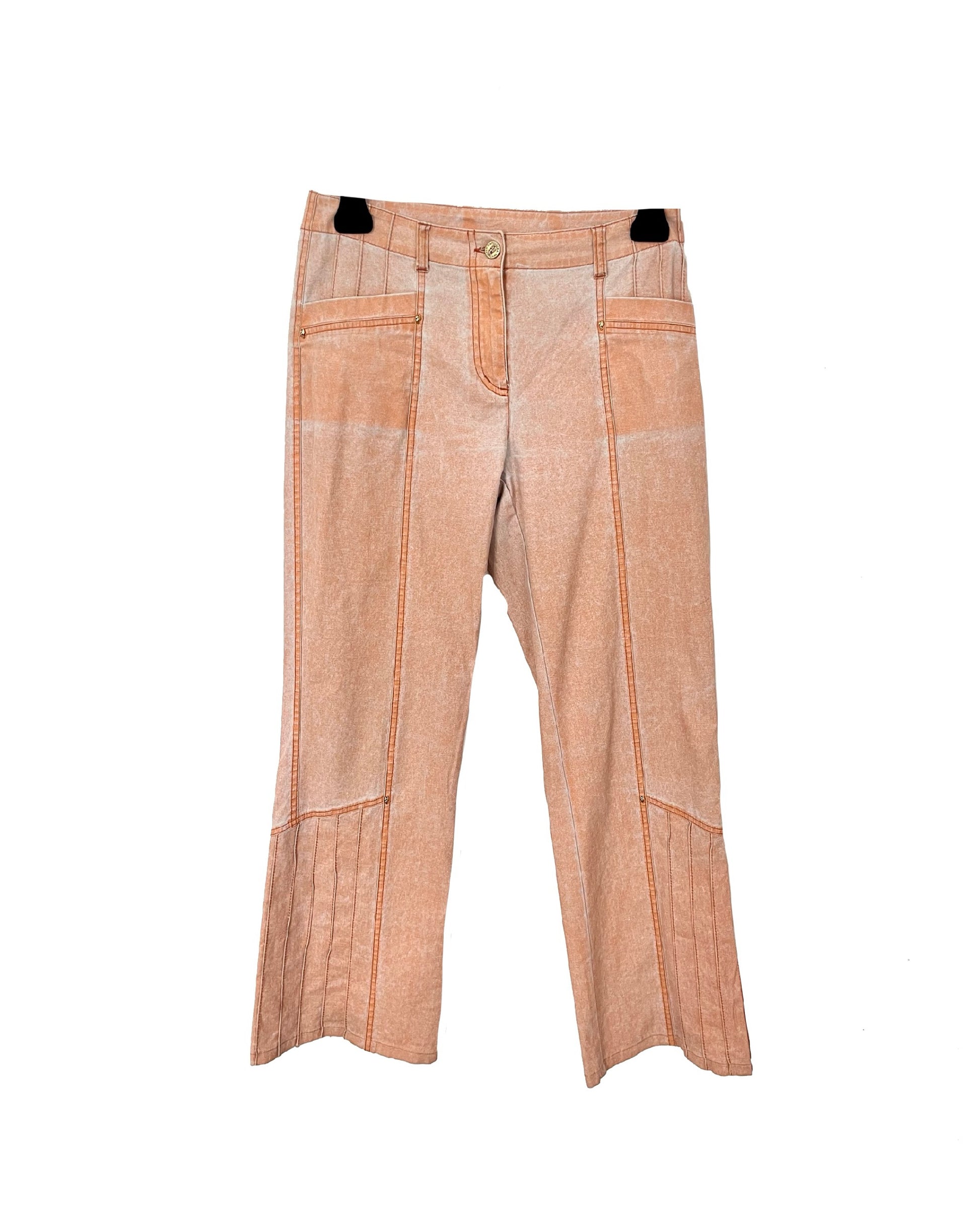 Pantalon vintage coupe droite légèrement évasée, couleur rose saumon délavé. Fermeture éclair au bas des jambes et détails de nervures sur les poches et le bas du pantalon.