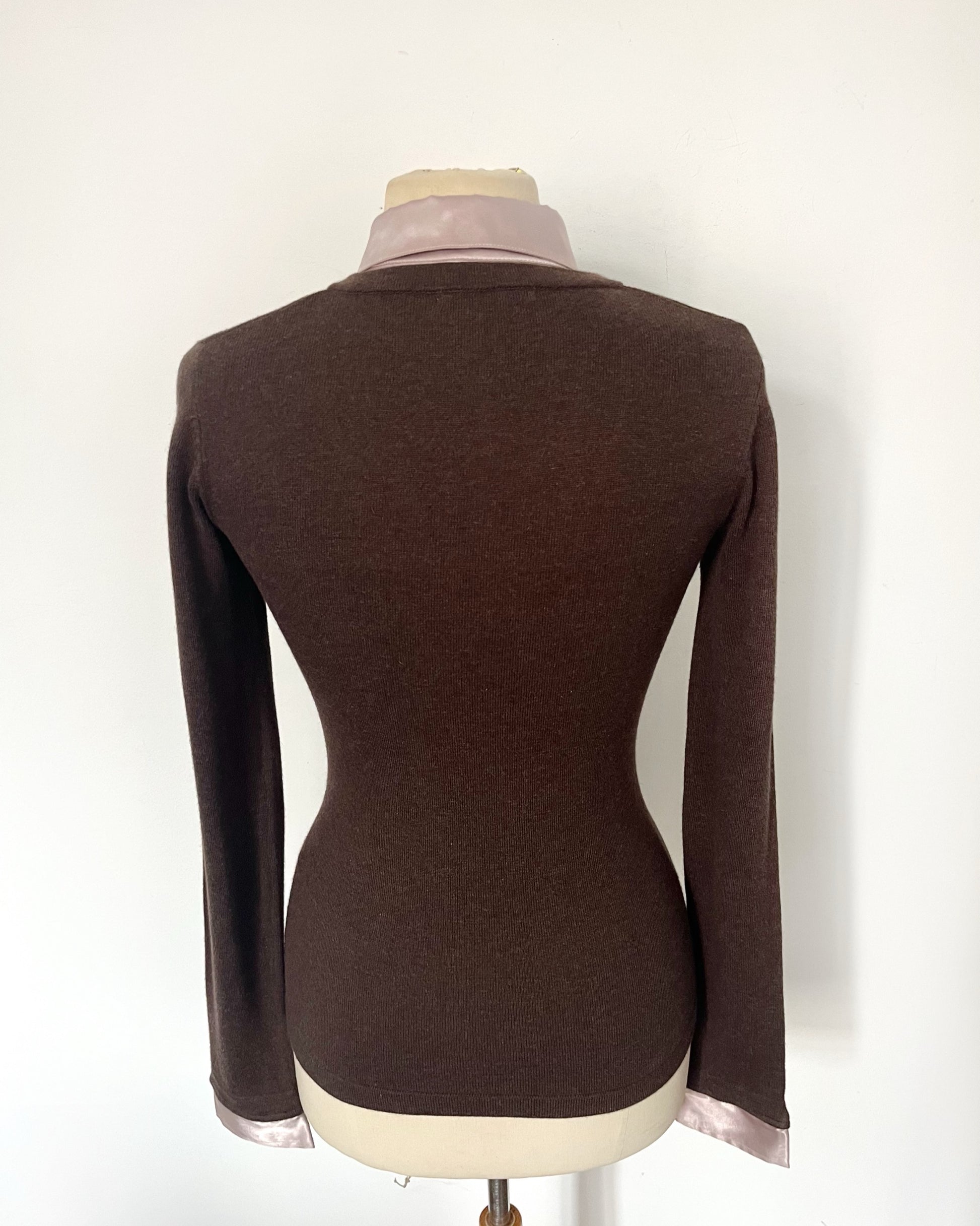 Pull fin vintage à manches longues, avec un col en soie rose parme qui se noue sur la poitrine. Le même détail en soie se retrouve au bas des manches. Confortable et doux, composé de viscose, coton et angora. Pièce originale en très bon état. TAILLE 38