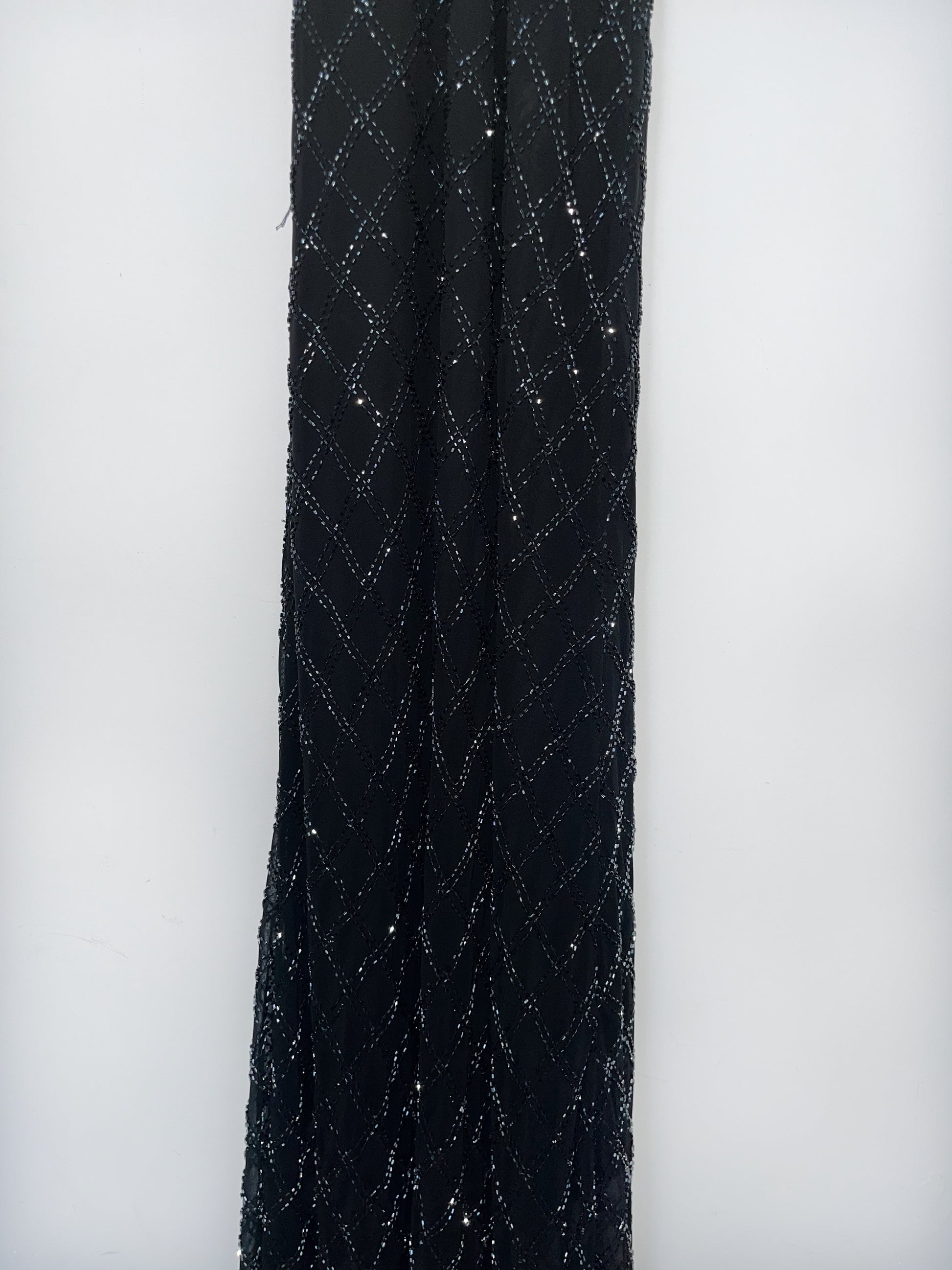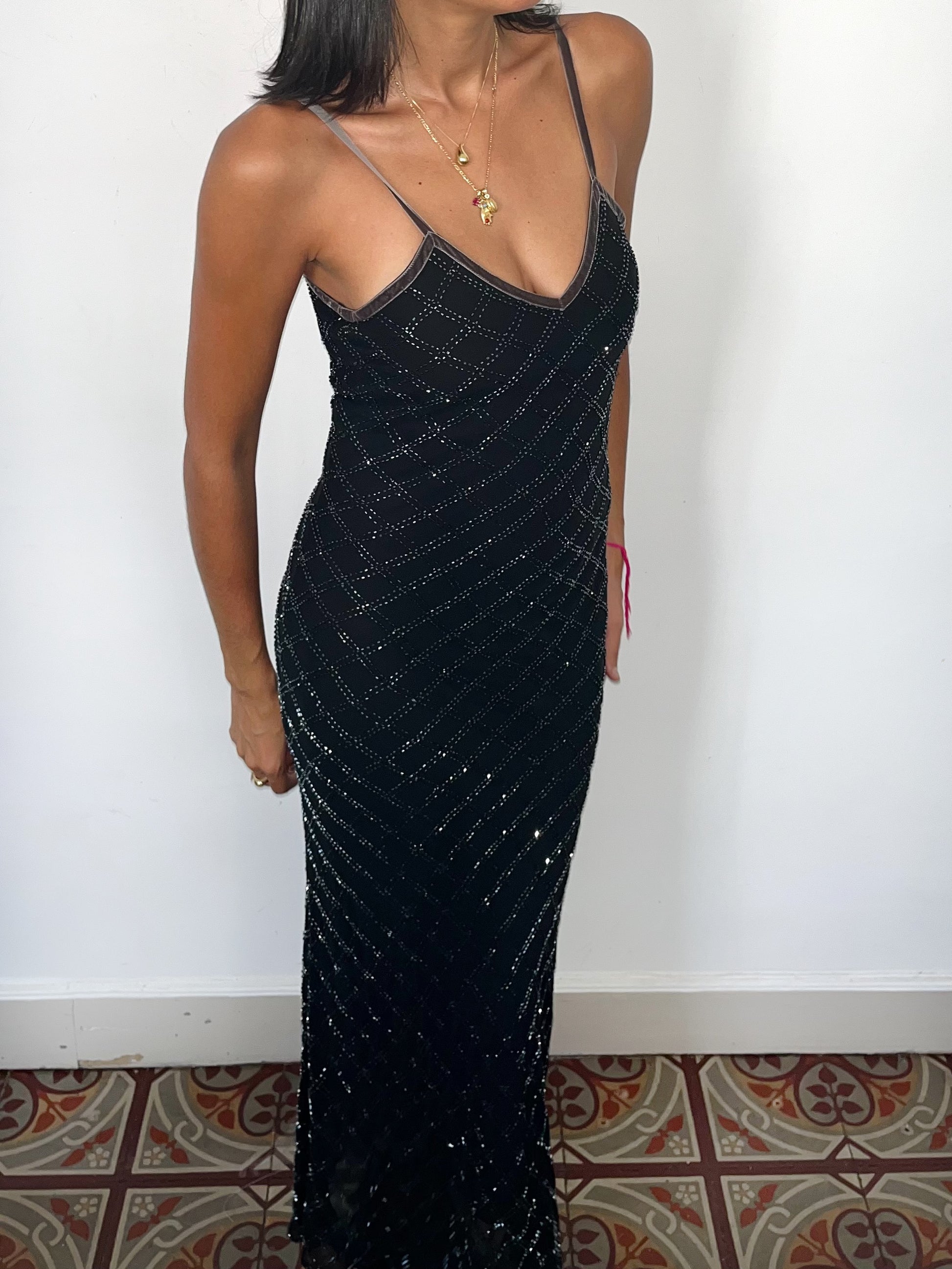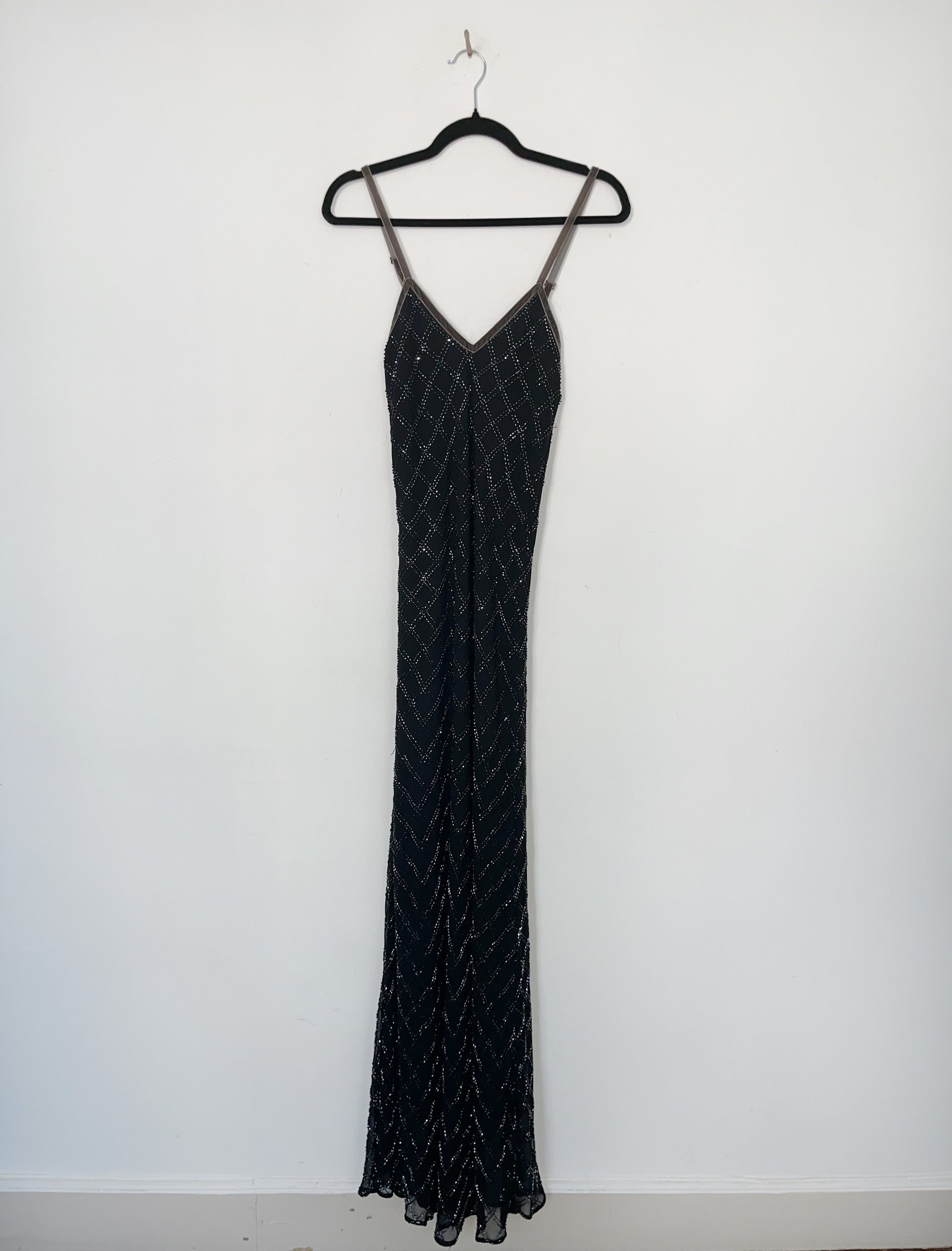 Robe de soirée vintage longue, à fines bretelles ajustables. Entièrement brodée de perles formant un motif en quadrillage losange. Doublée. Taille indiquée M, mais correspond plutôt à un 36 ou petit 38. Très bon état général.