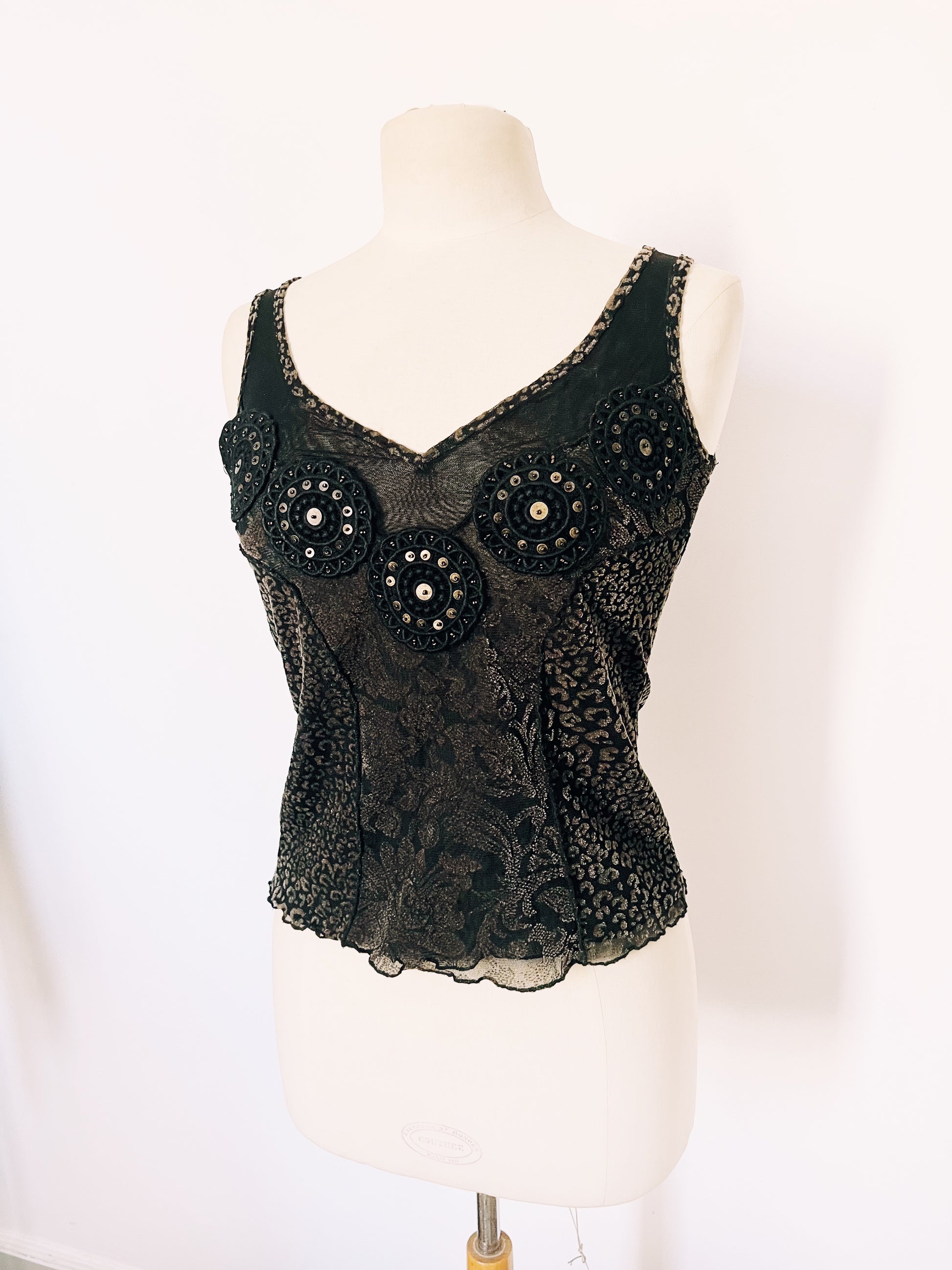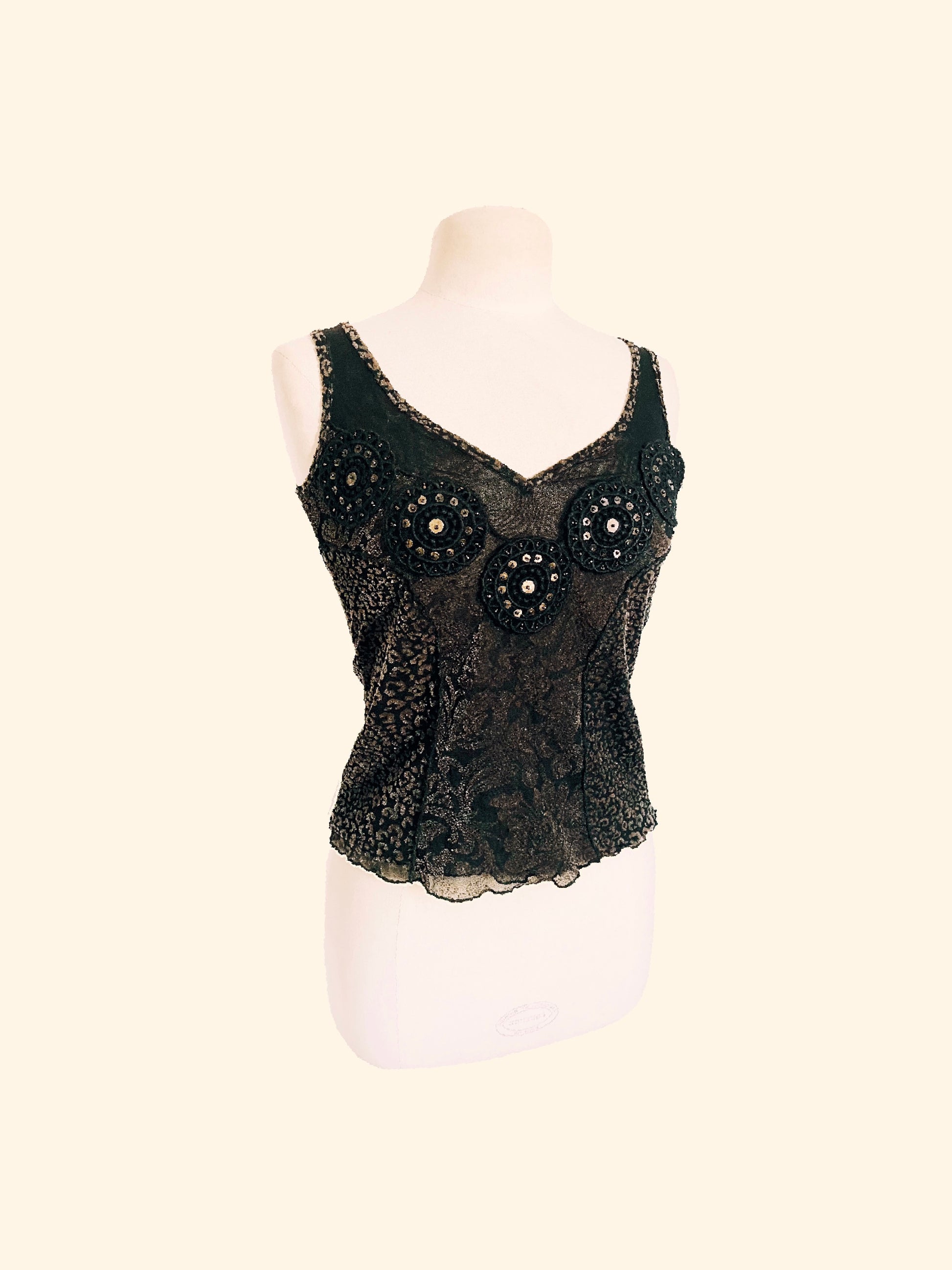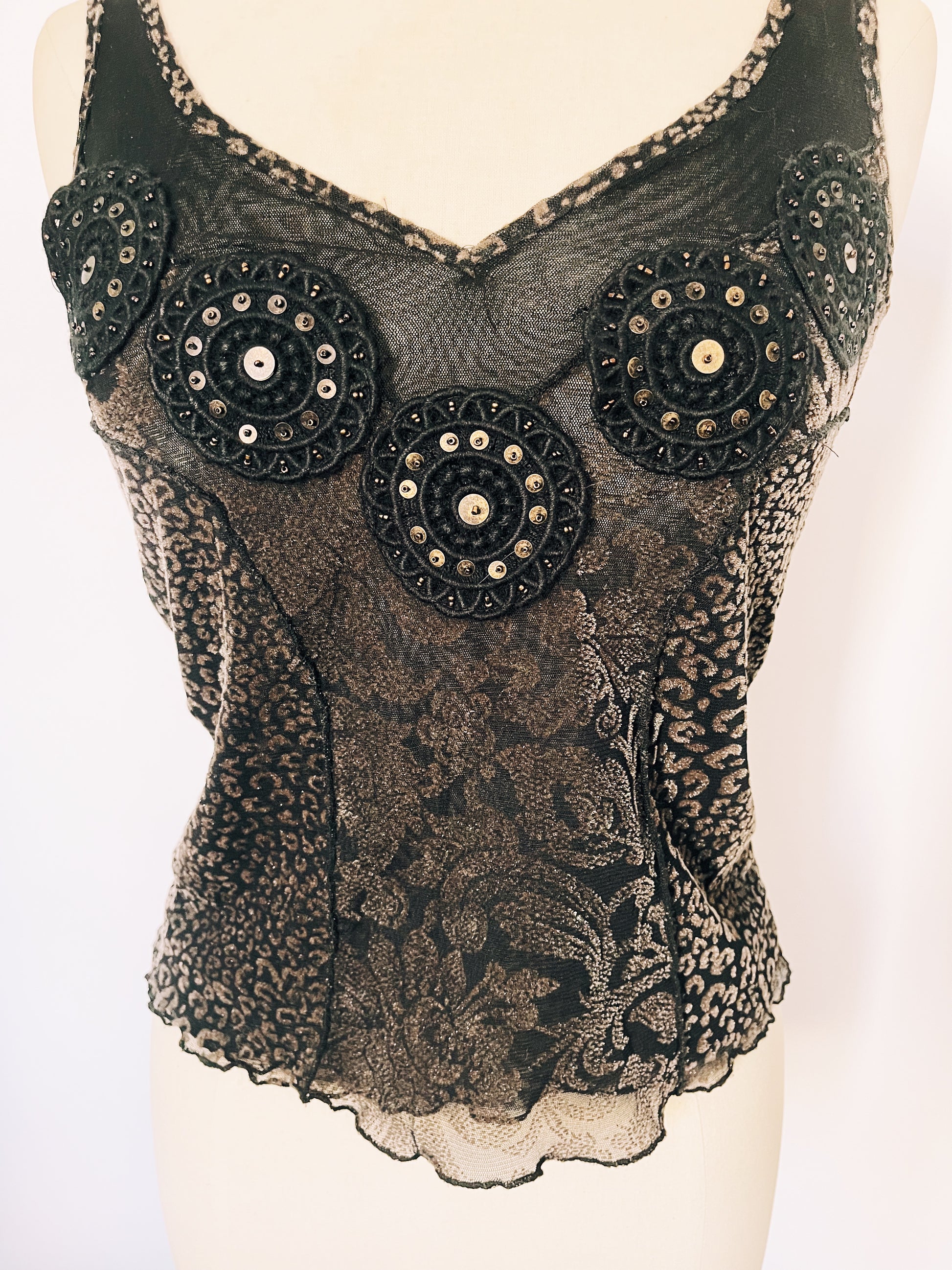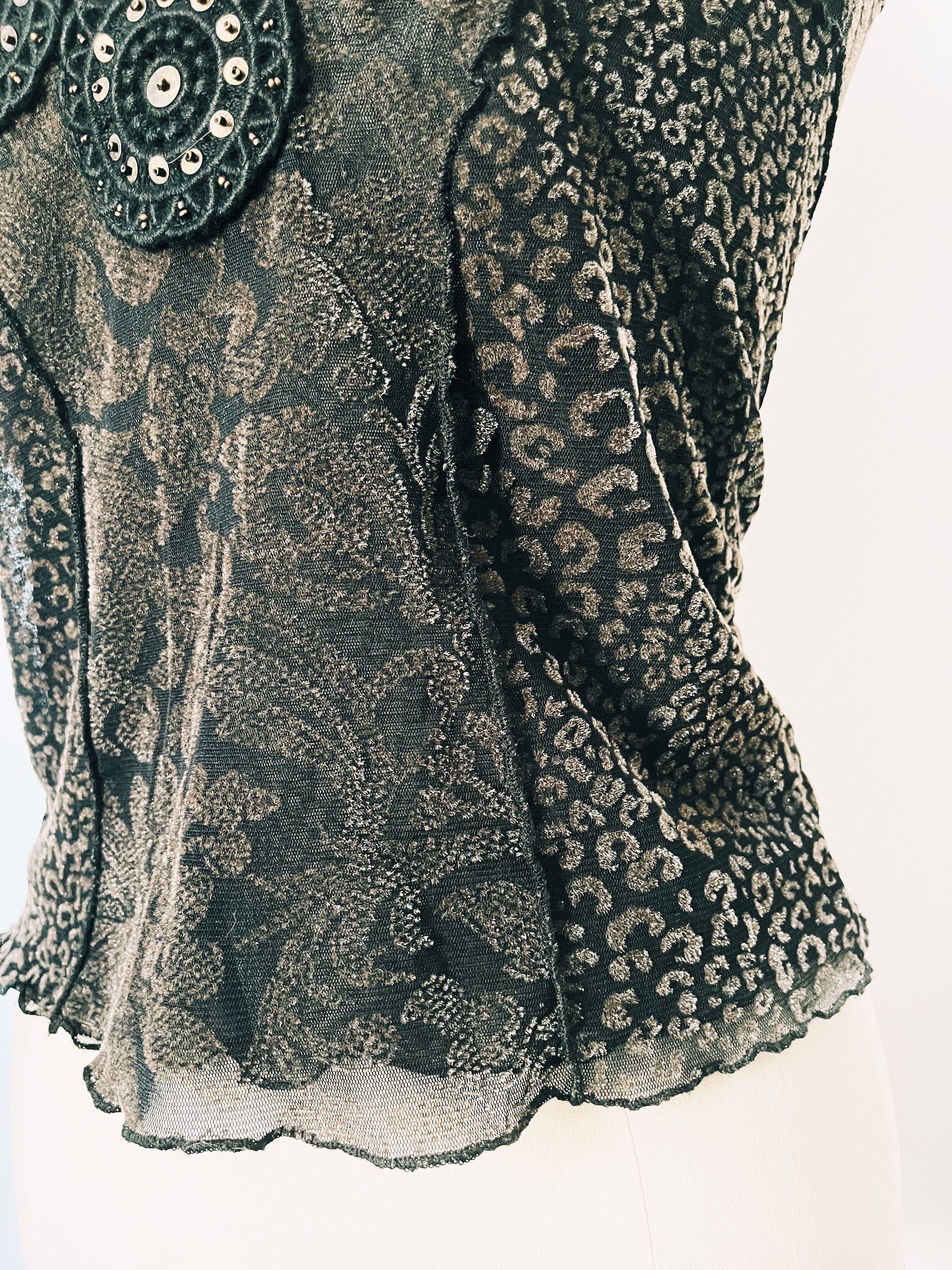 Top boho chic en mesh texturé velours avec motifs en relief léopard, détails de patch brodé sur la poitrine et sequins mordorés. Taille S, 100% polyamide, en très bon état.