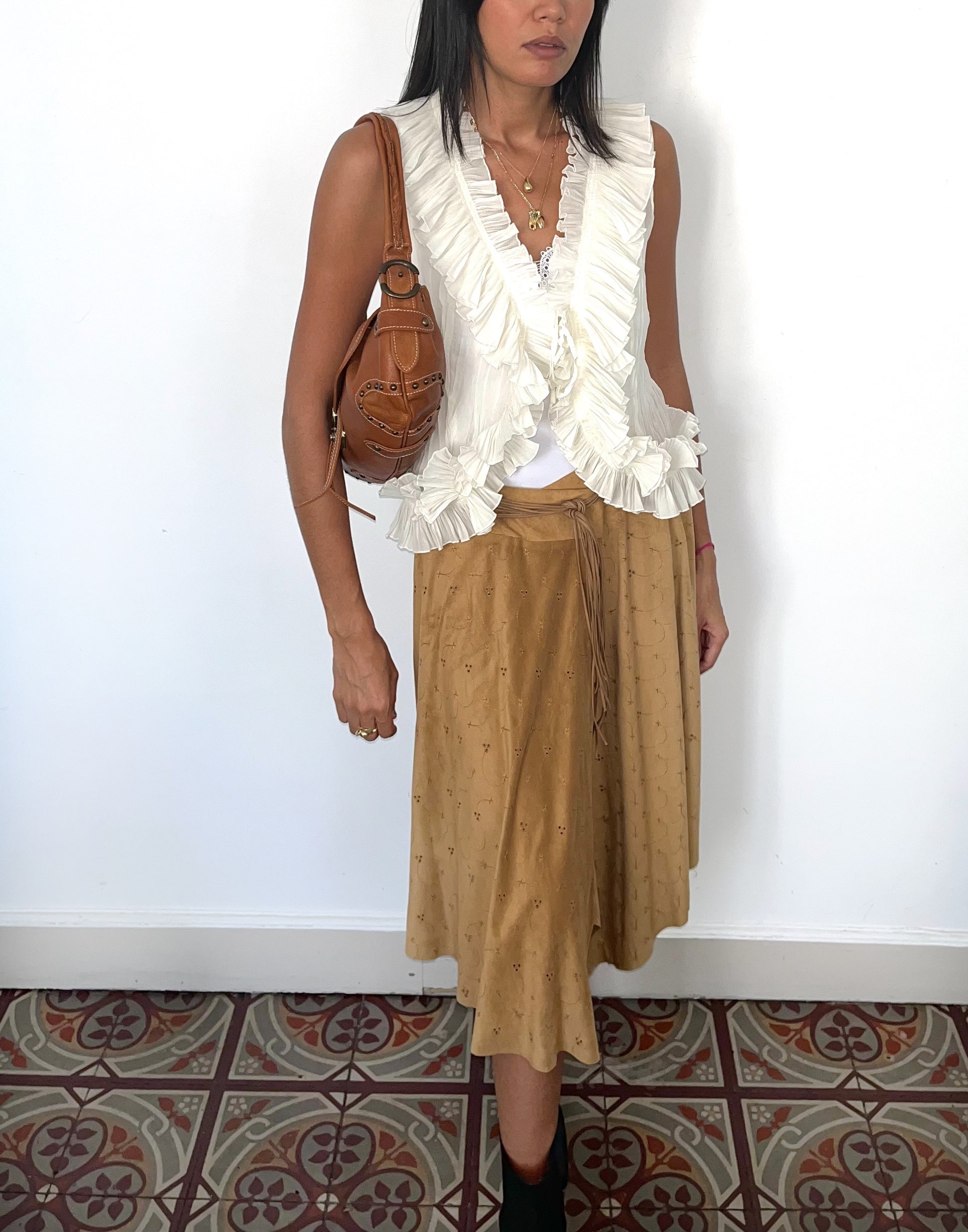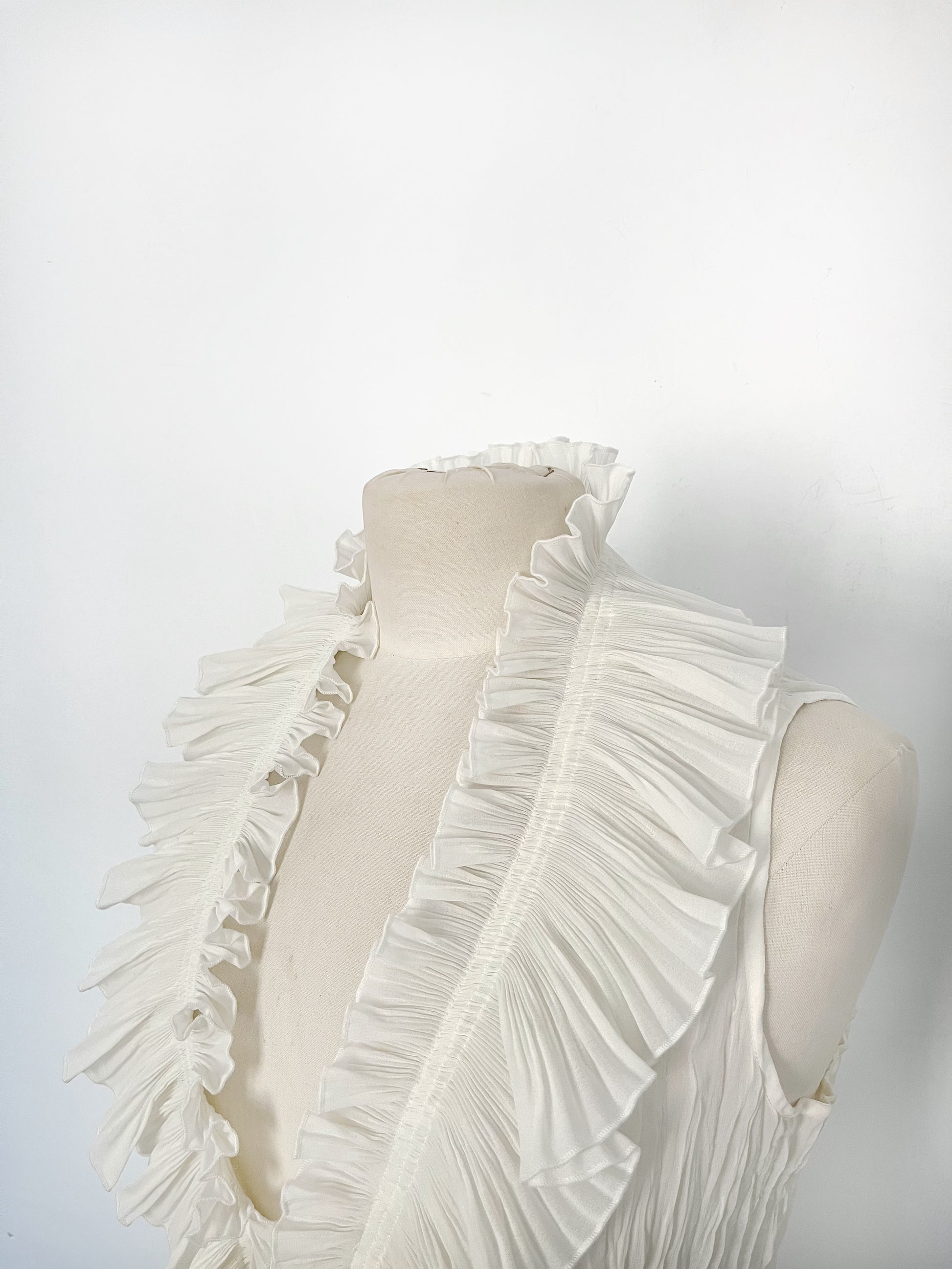 Top vintage fluide sans manches, couleur écru, avec volants. Se noue à la poitrine avec un lacet. En très bon état. Taille M.