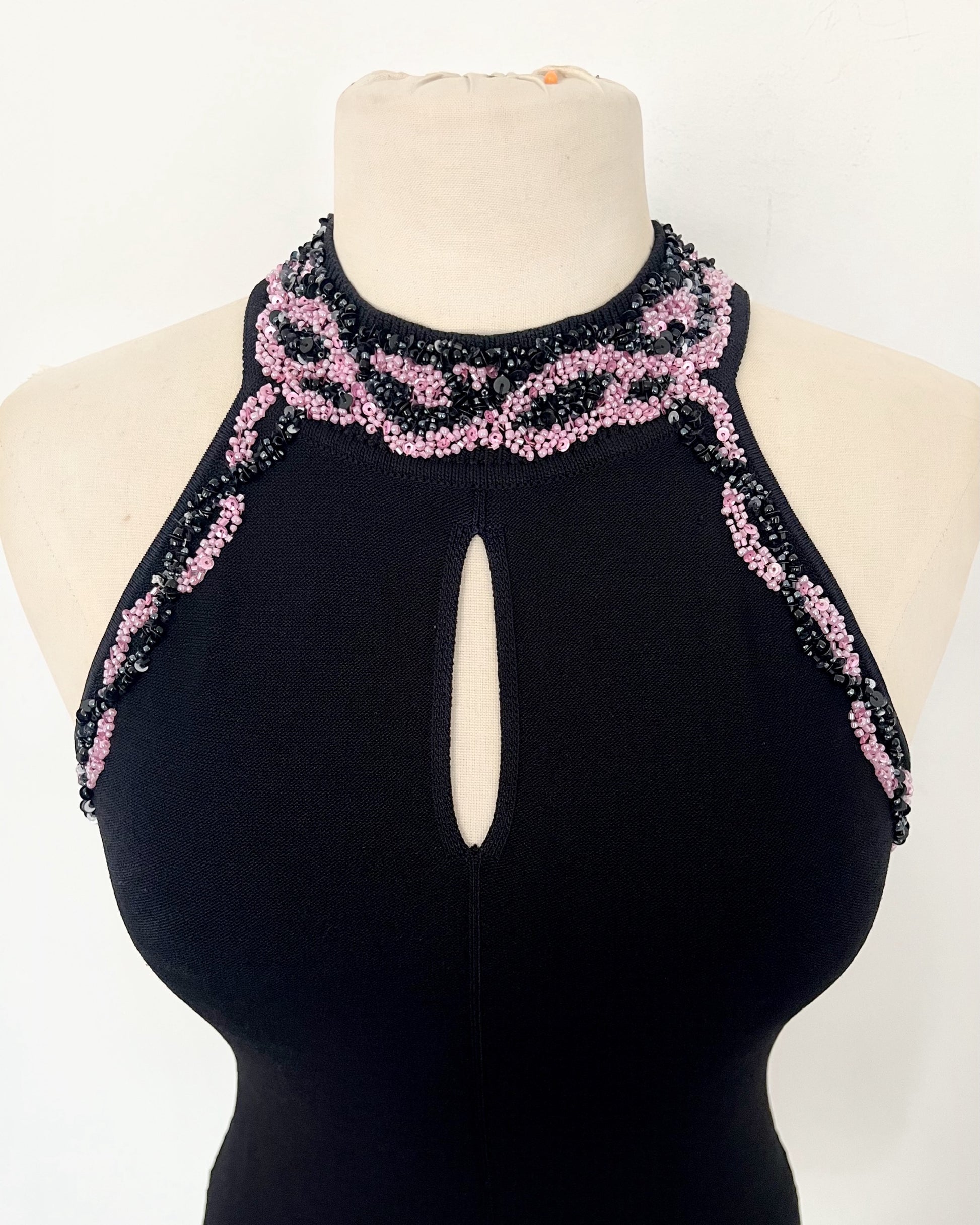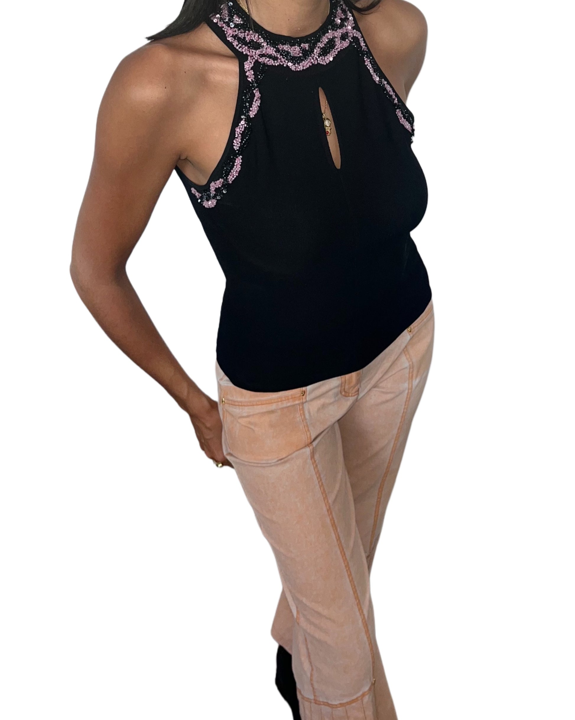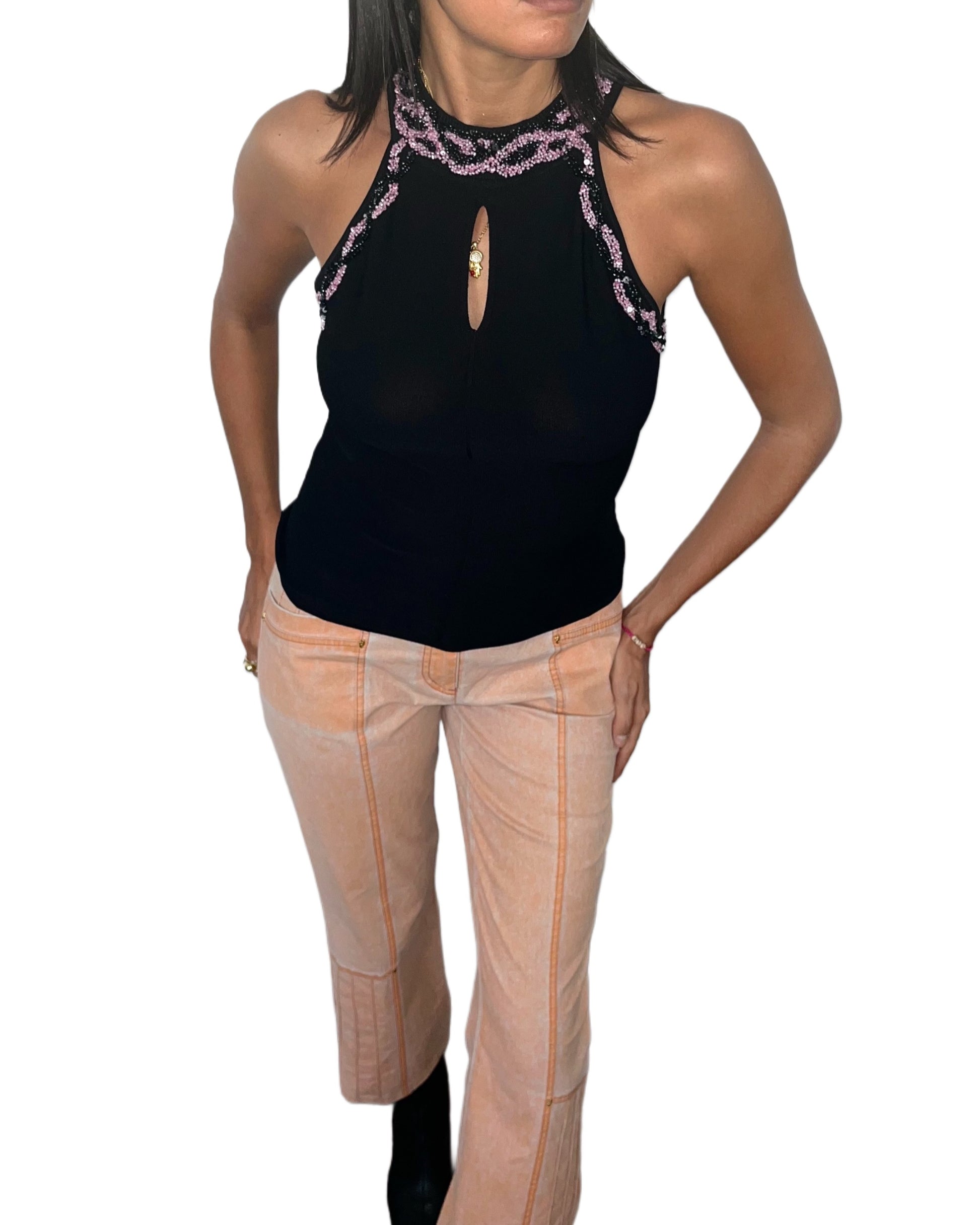 Top vintage col américain, extensible, avec détails de broderies perlées autour du col et des aisselles. Fente en forme de goutte au niveau de la poitrine.