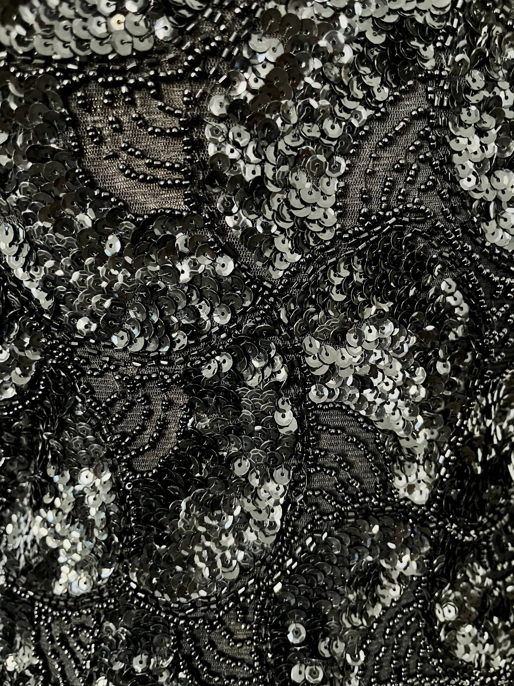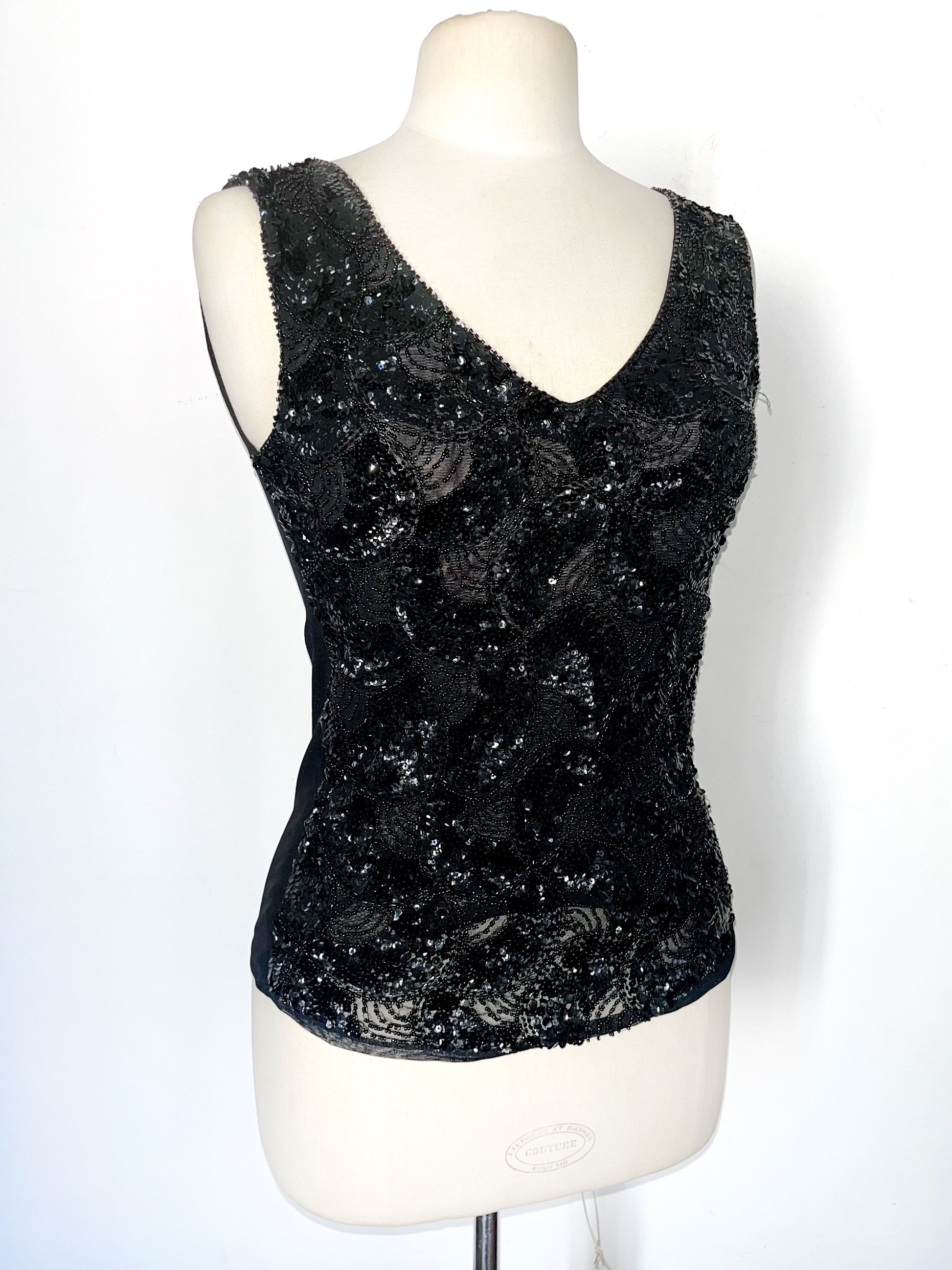 Top vintage en mesh noir opaque, avec détails brodés de sequins et perles noires. Matière extensible pour un porté ajusté. En parfait état. Taille L/40.