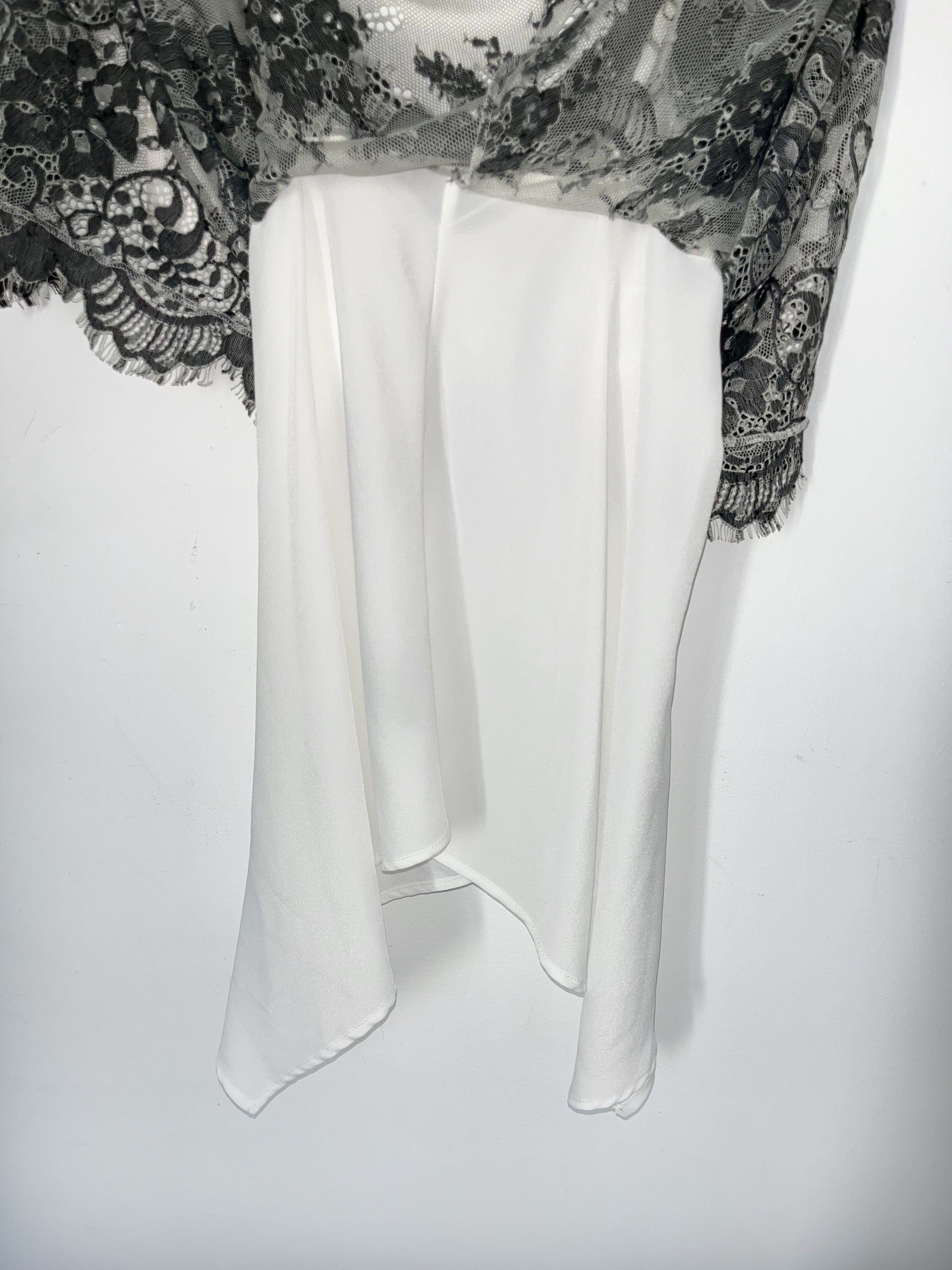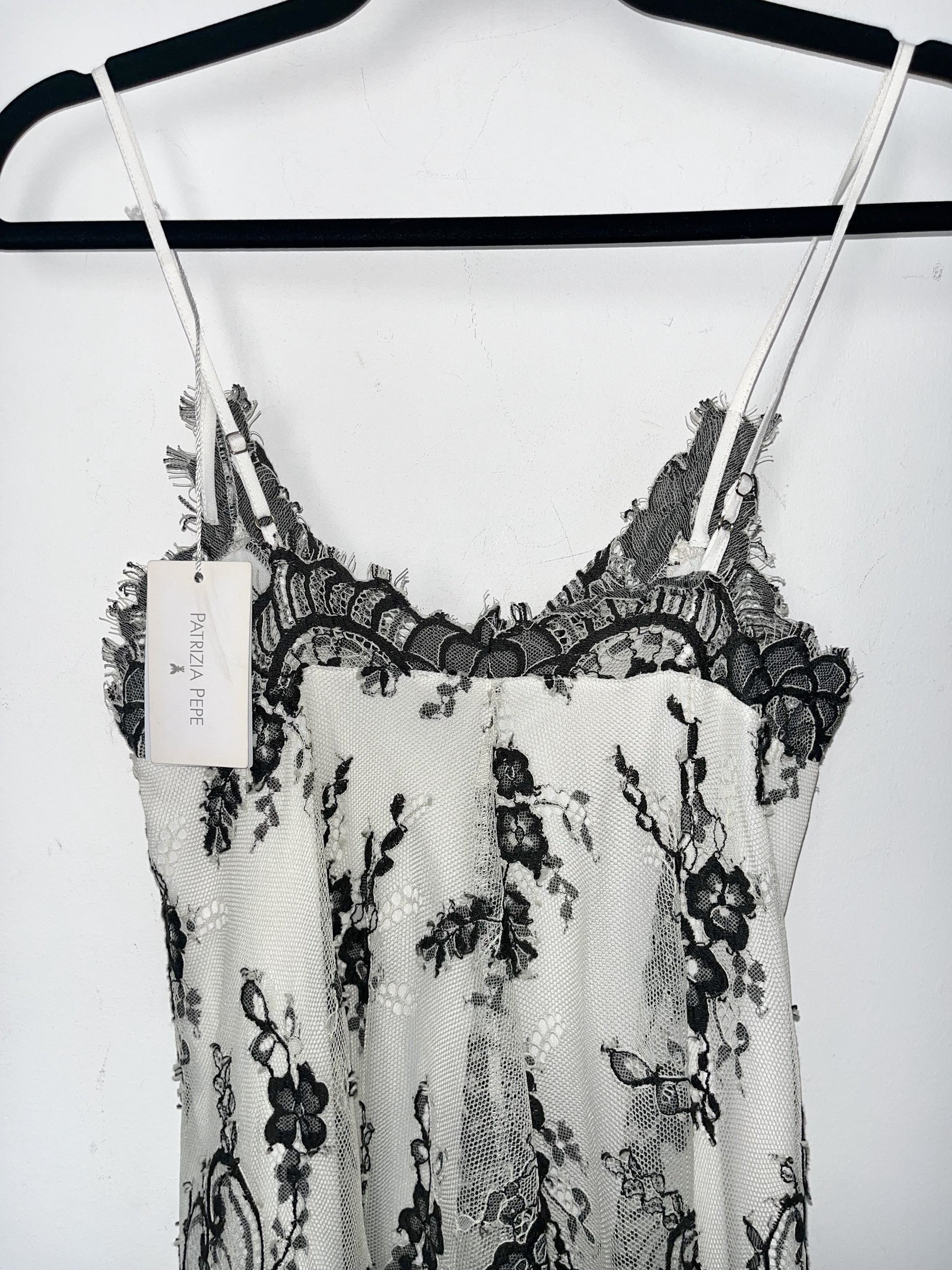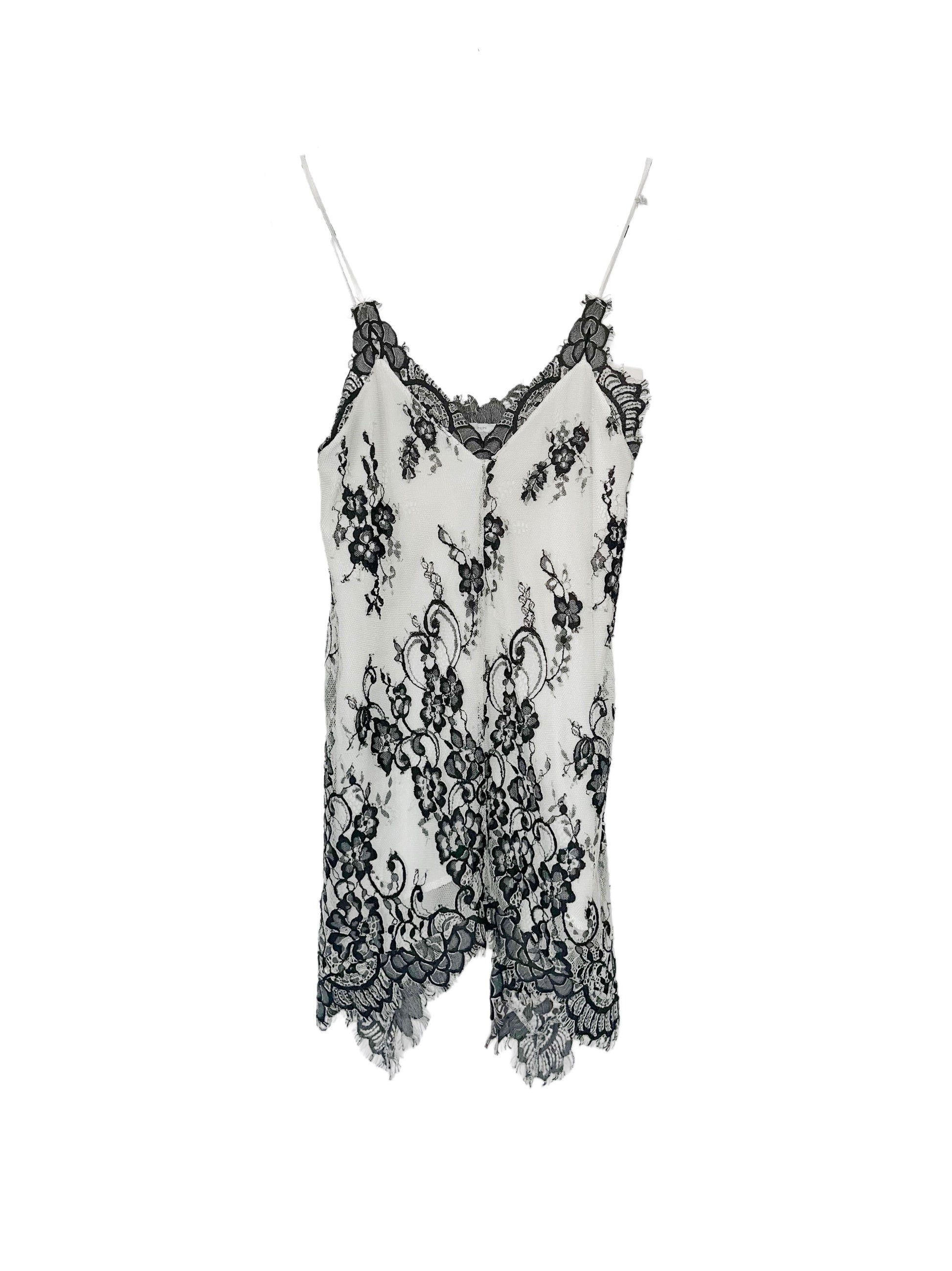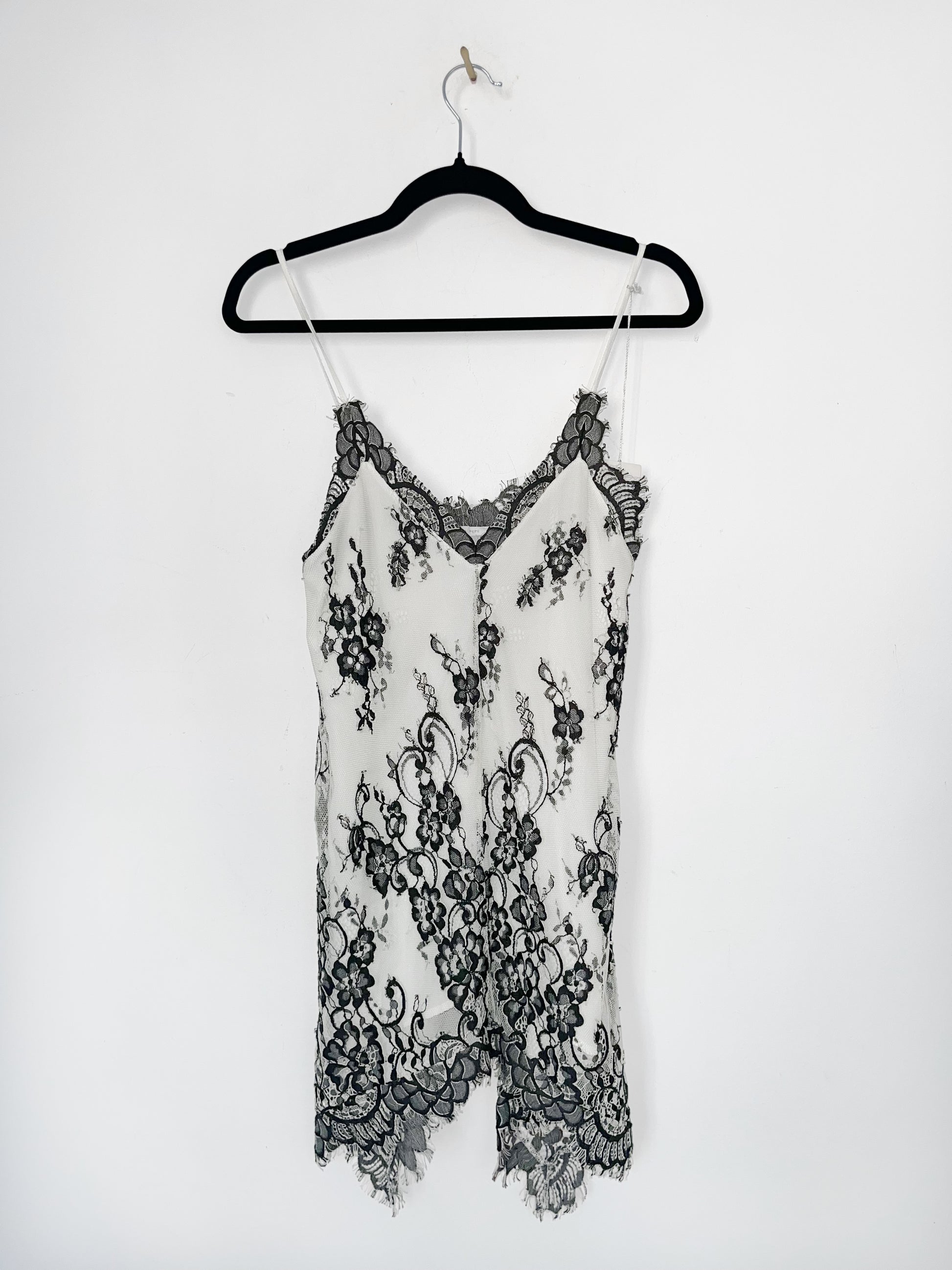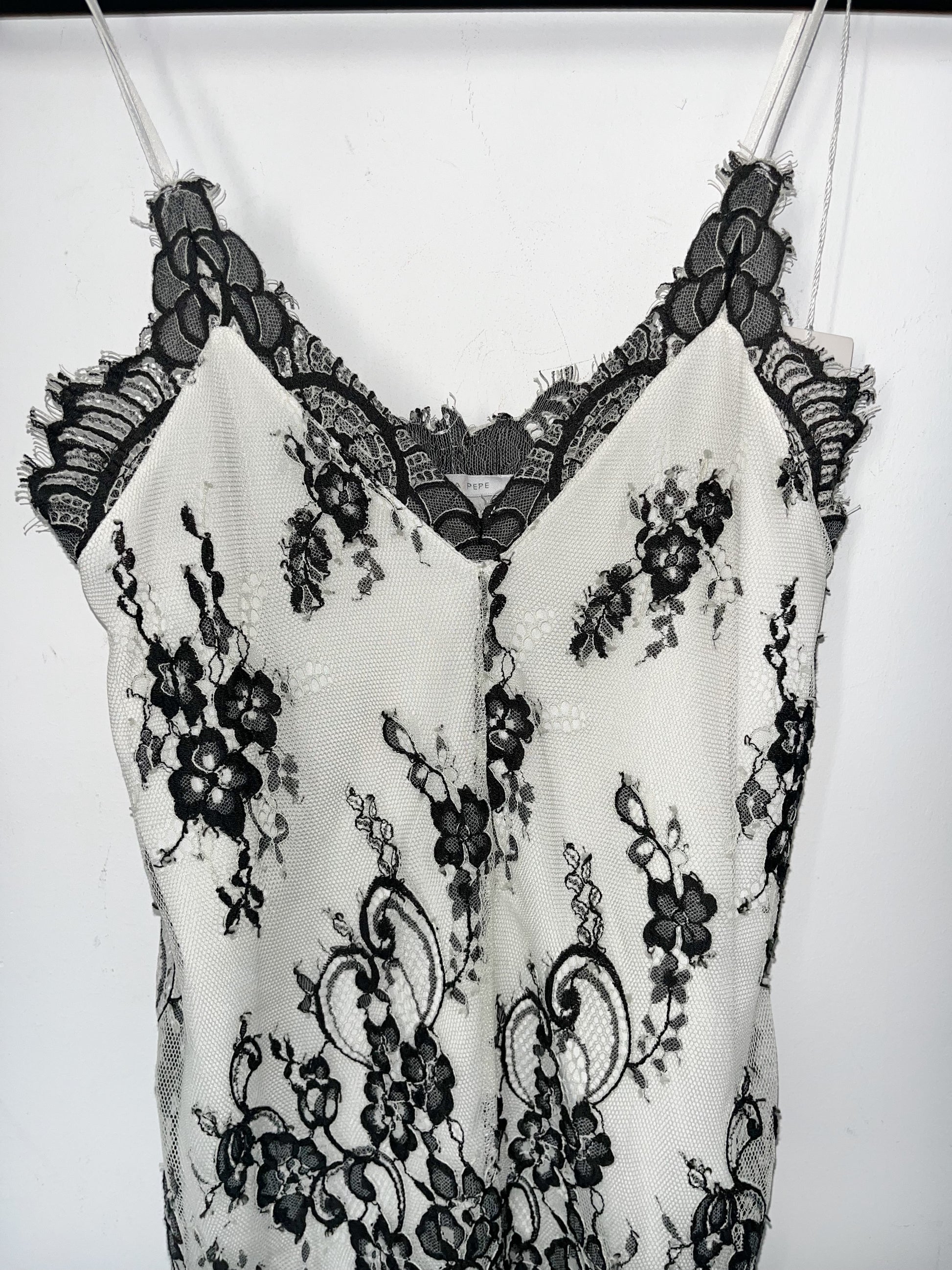 Top vintage Patrizia Pepe style lingerie, coupe asymétrique à fines bretelles ajustables. Dentelle fleurie bicolore noire et blanche. Neuf avec étiquette. Taille indiquée 38, mais convient plutôt à un bon 34 ou petit 36. Matière : coton et polyamide.