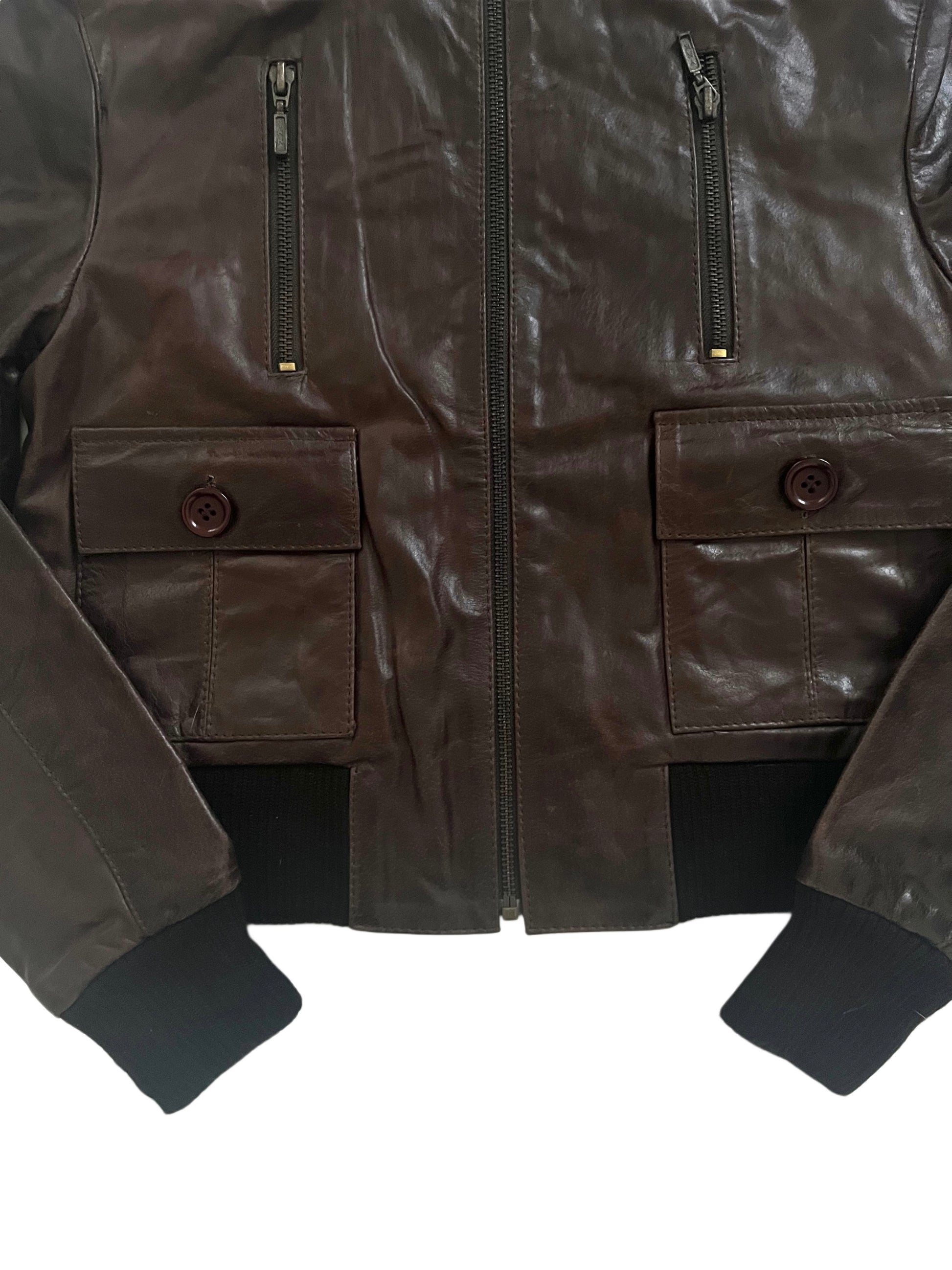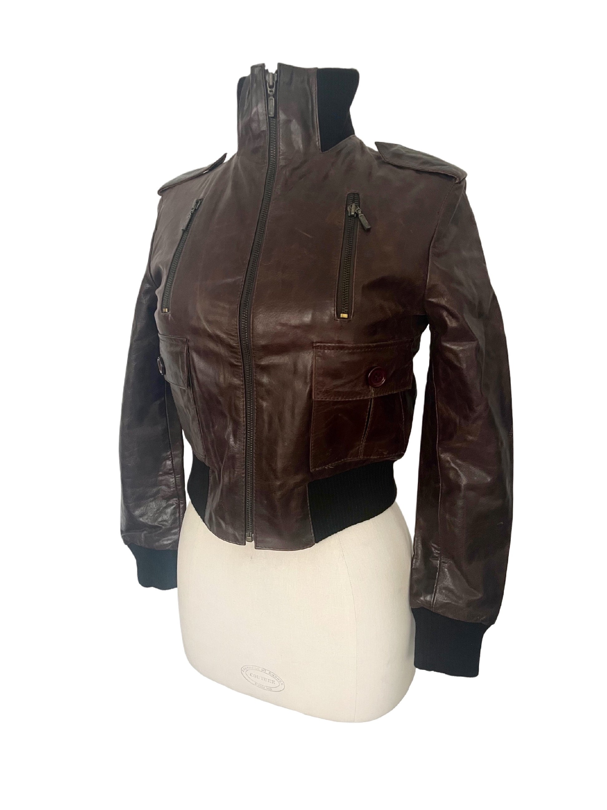 Blouson vintage en cuir véritable marron, coupe cintrée et col montant.