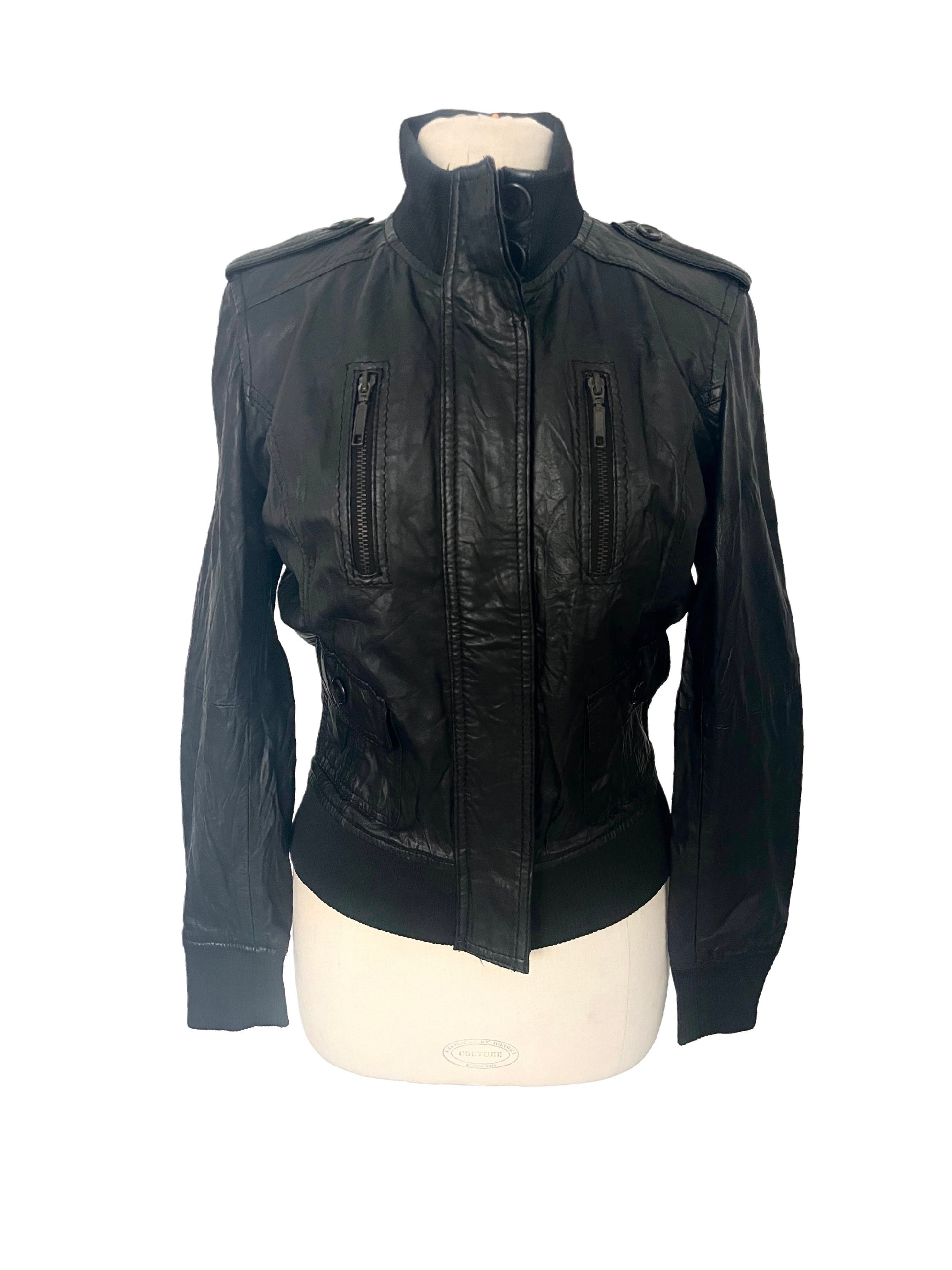 Blouson vintage en cuir véritable noir, souple et de belle qualité.