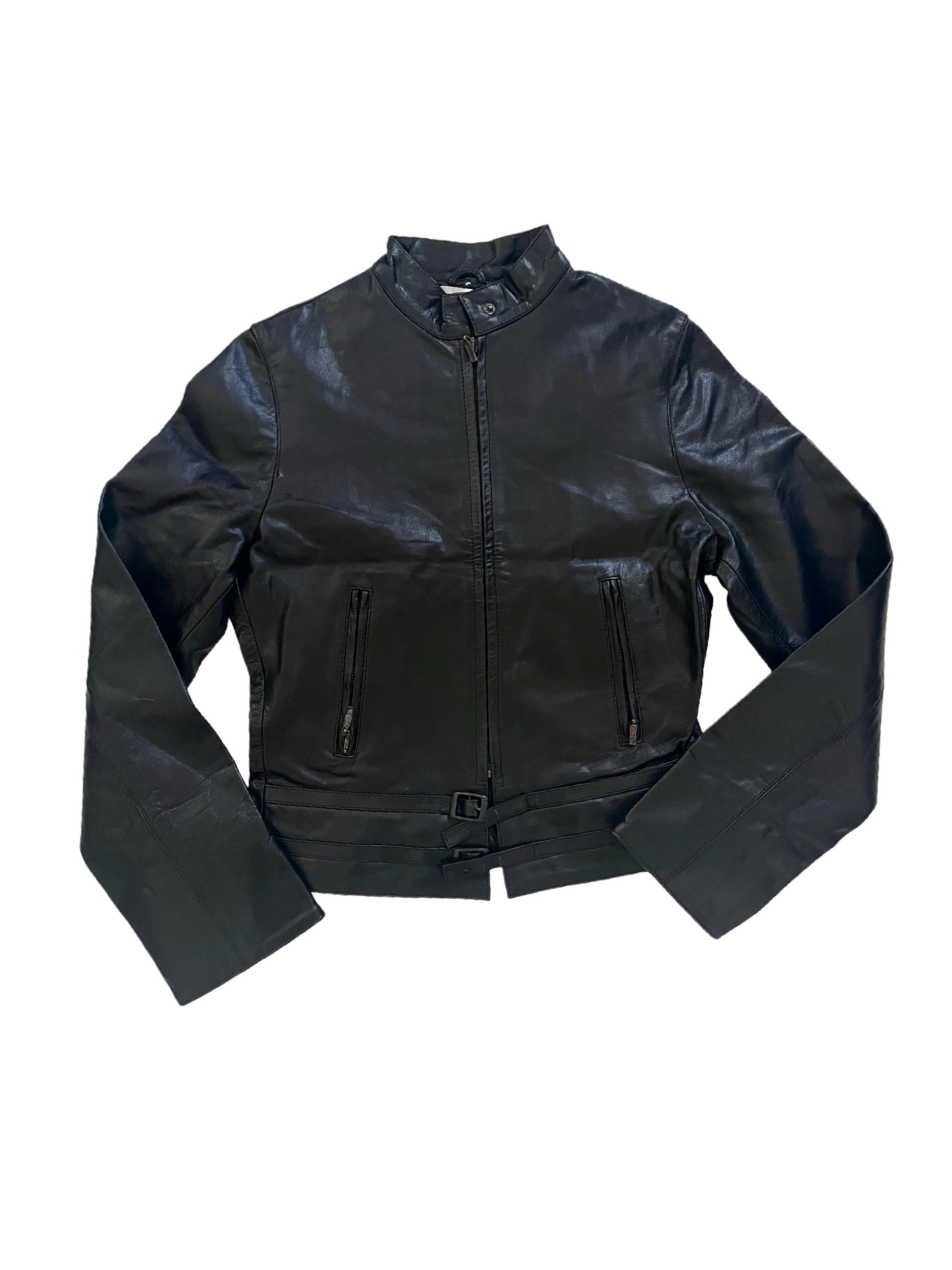 Veste vintage en cuir véritable noir, style biker. Col montant avec fermeture par bouton-pression, zip frontal et sangles fines ajustables à la base.