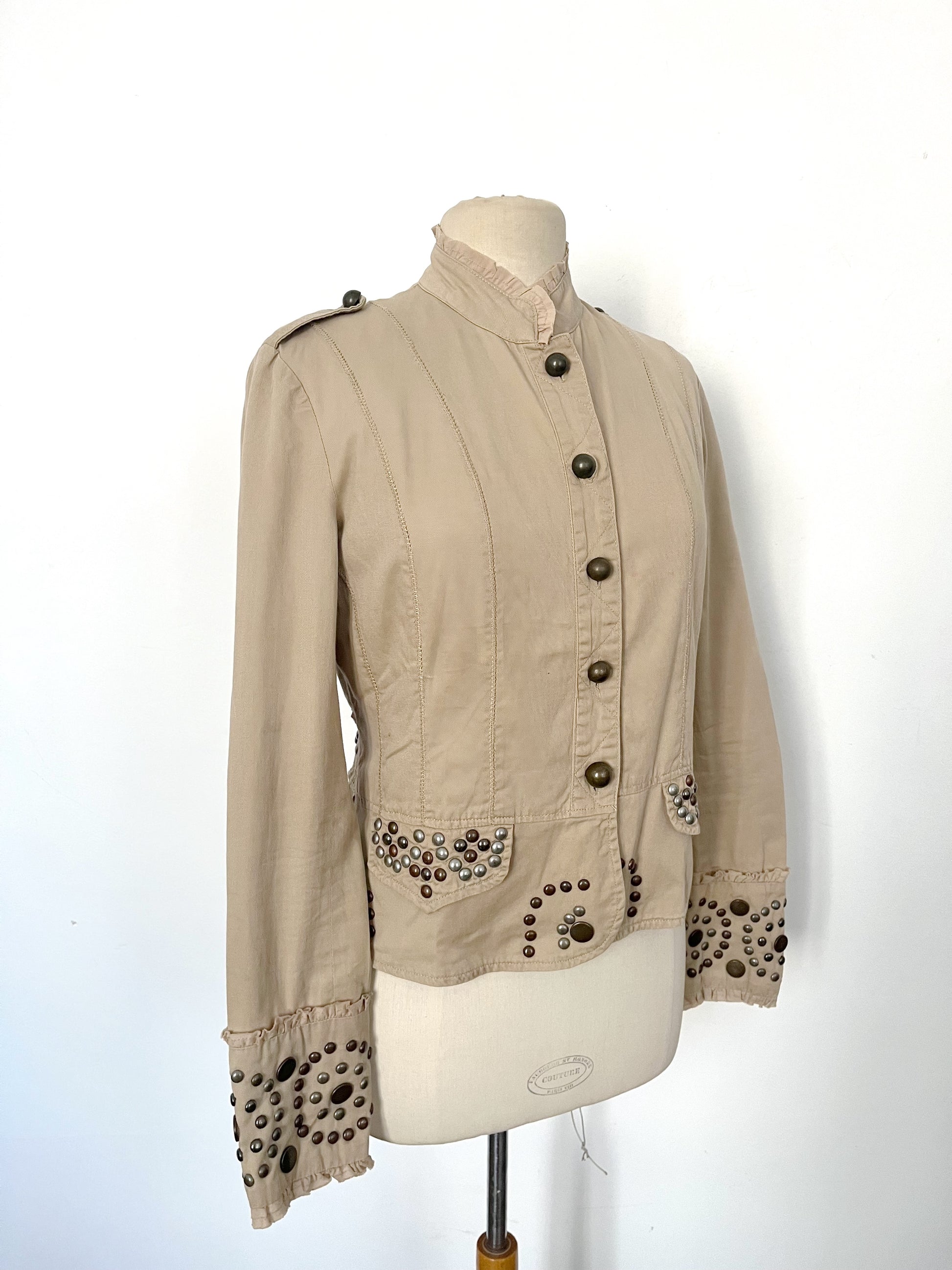 Veste vintage légère avec col style officier, détails de boutons mordorés et rivets sur le bas des manches, le bas de la veste et au dos. Coupe ajustée. En très bon état. Taille 38.