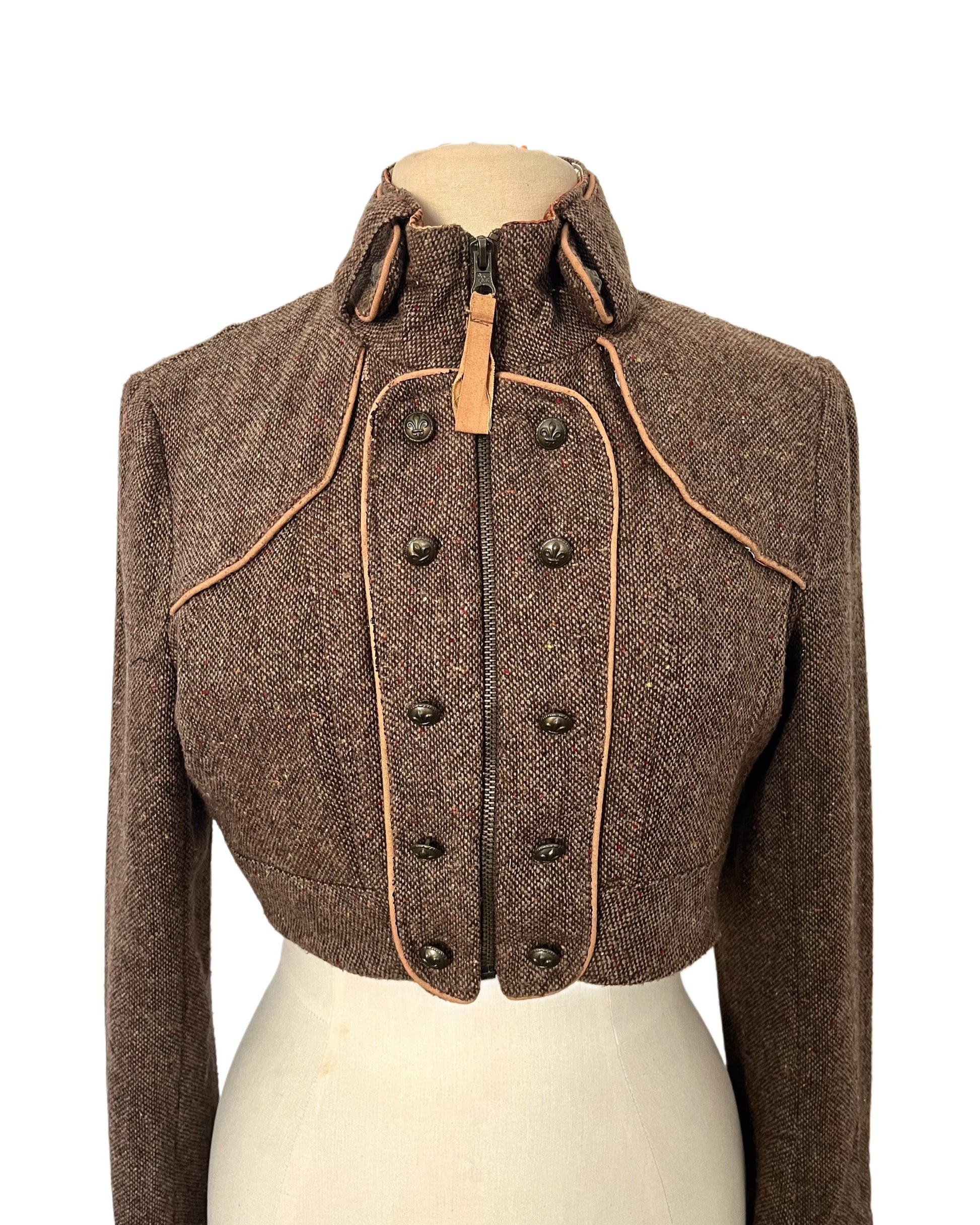 Veste vintage courte en laine mouchetée marron clair, avec détails de boutons bronze antique et soufflets sur le haut de la poitrine. Doublure satinée à motif rétro intacte. Composition : 30 % laine, 40 % polyester, 25 % acrylique, 5 % viscose. En très bon état. Taille L.