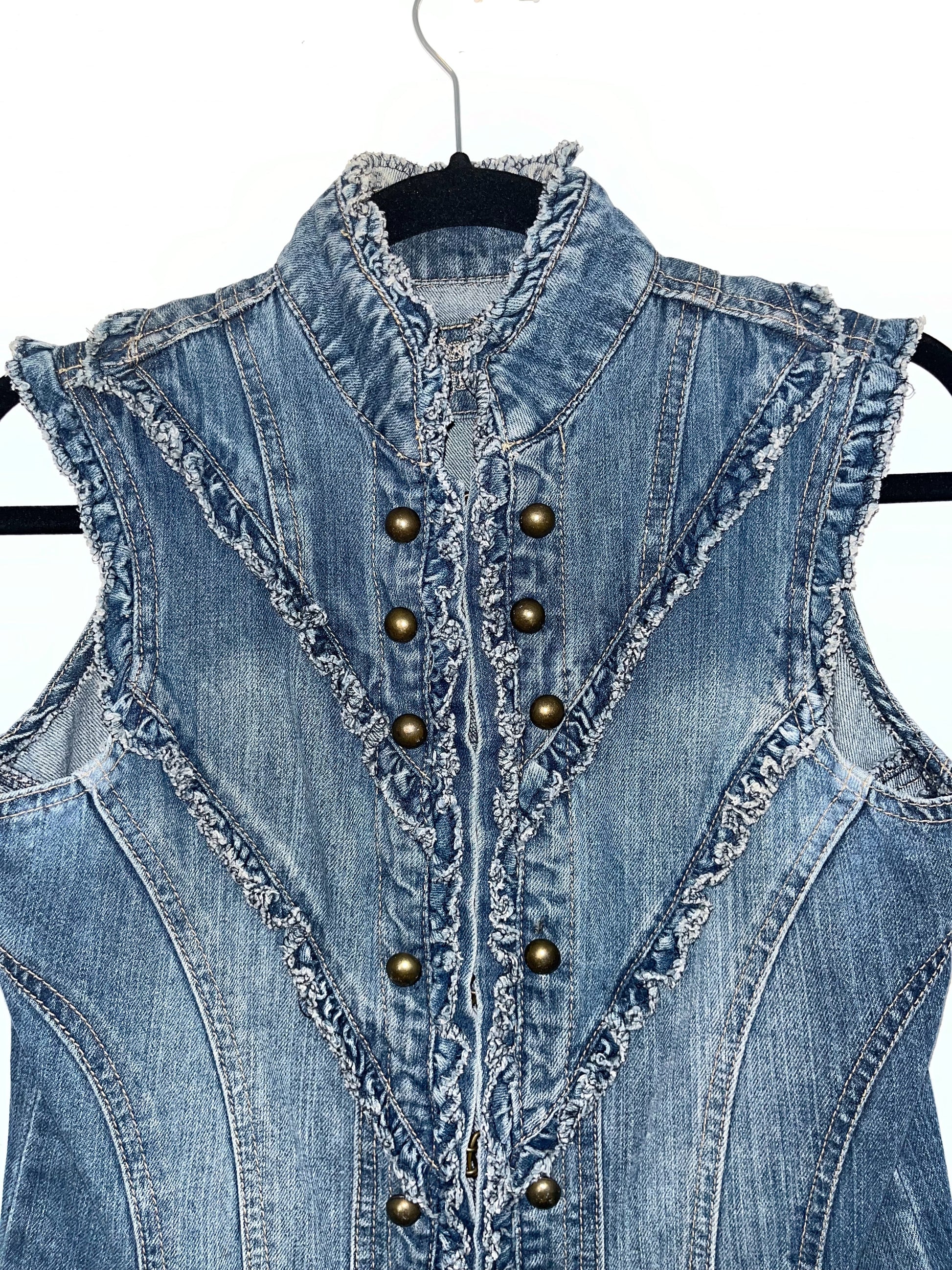 Veste vintage sans manches en jean, avec détails de fronces ornementales et boutonnière mordorée style officier. 100 % coton. En parfait état.